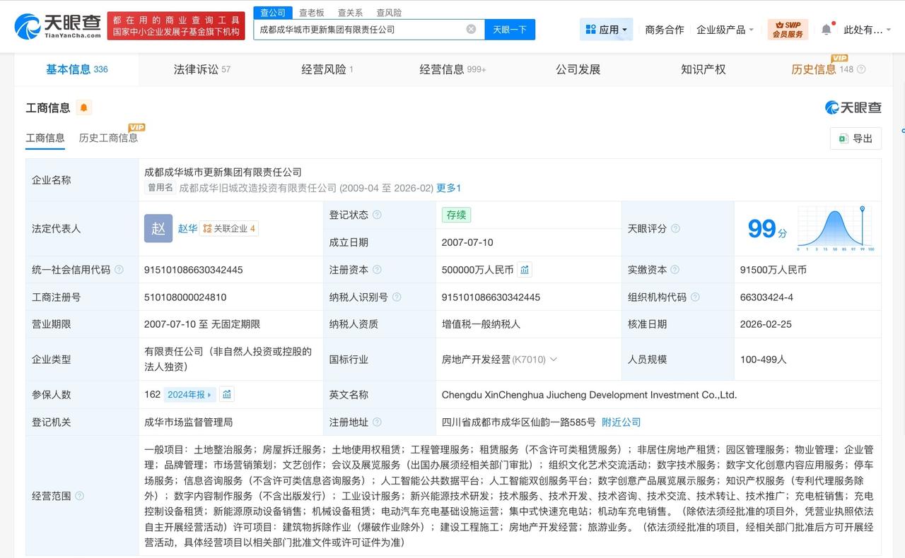 成都成华城市更新集团增资至50亿 增幅约39% 天眼查工商信息显示,近日,成都成华旧城改造投资有限责任公司发生工商变更,企业名称变更为成都成华城市更新集团有限责任公司,注册资本由36亿人民币增至50亿人民币,增幅约39%,同时,部分高管也发生变更。 该公司成立于2007年7月,法定代表人为赵华,经营范围含土地整治服务、房屋拆迁服务、土地使用权租赁、工程管理服务、租赁服务、非居住房地产租赁、物业管理、企业管理、人工智能公共数据平台等。股东信息显示,该公司由成都市成华发展集团有限责任公司全资持股。 天眼查信息: