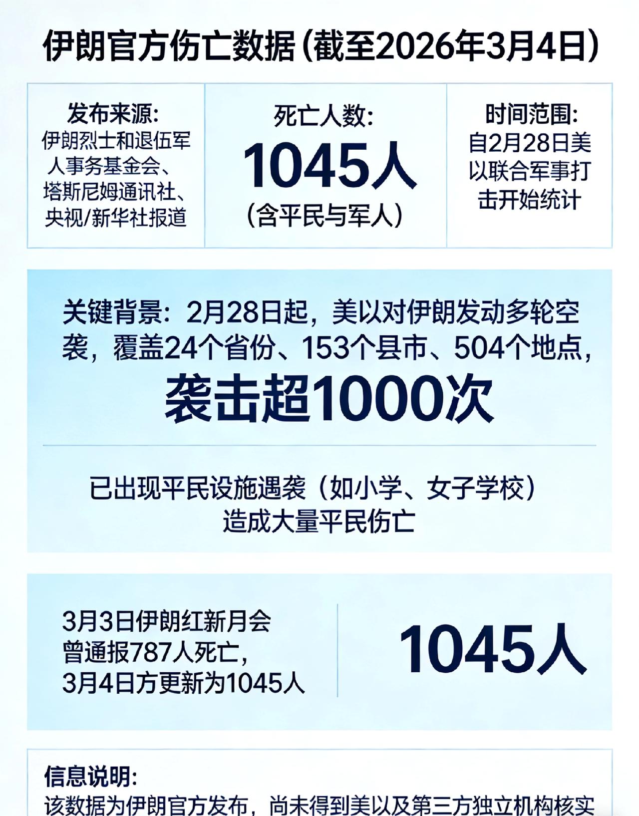 伊朗官方最新数据(截至2026年3月4日) - 死亡人数:1045人(含平民与军人) - 发布来源:伊朗烈士和退伍军人事务基金会、塔斯尼姆通讯社、央视/新华社报道 - 时间范围:自2月28日美以联合军事打击开始统计 关键背景 - 2月28日起,美以对伊朗发动多轮空袭,覆盖24个省份、153个县市、504个地点,袭击超1000次 - 已出现平民设施遇袭(如小学、女子学校),造成大量平民伤亡 - 3月3日伊朗红新月会曾通报787人死亡,3月4日官方更新为1045人 信息说明 该数据为伊朗官方发布,尚未得到美以及第三方独立机构核实。
