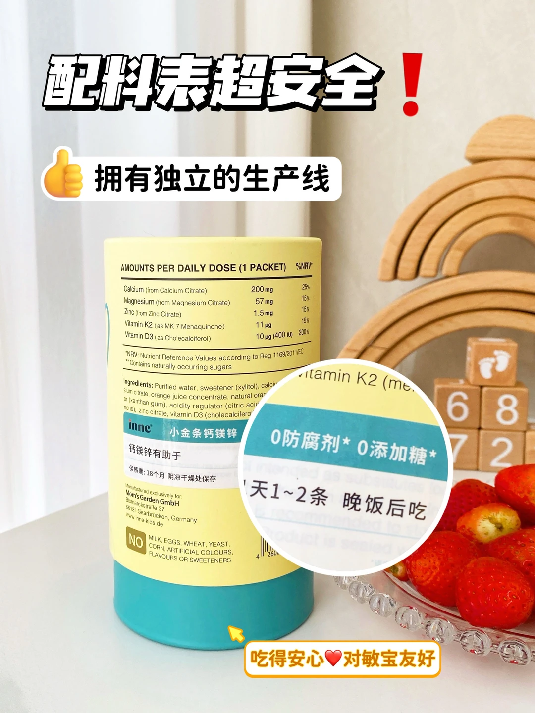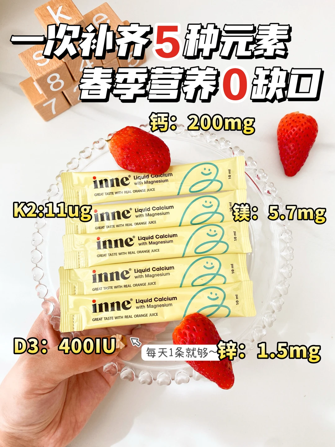 我家一直在补的是inne钙镁锌,它的营养也很丰富,有5重营养,钙镁锌协同营养是春季拔节刚需,也配足了400单位的维生素D3,稳稳的很放心!而且我比较看重inne的安全性,配料表干干净净的,而且是独立生产线不用担心夹杂过敏原,对敏宝也很友好。