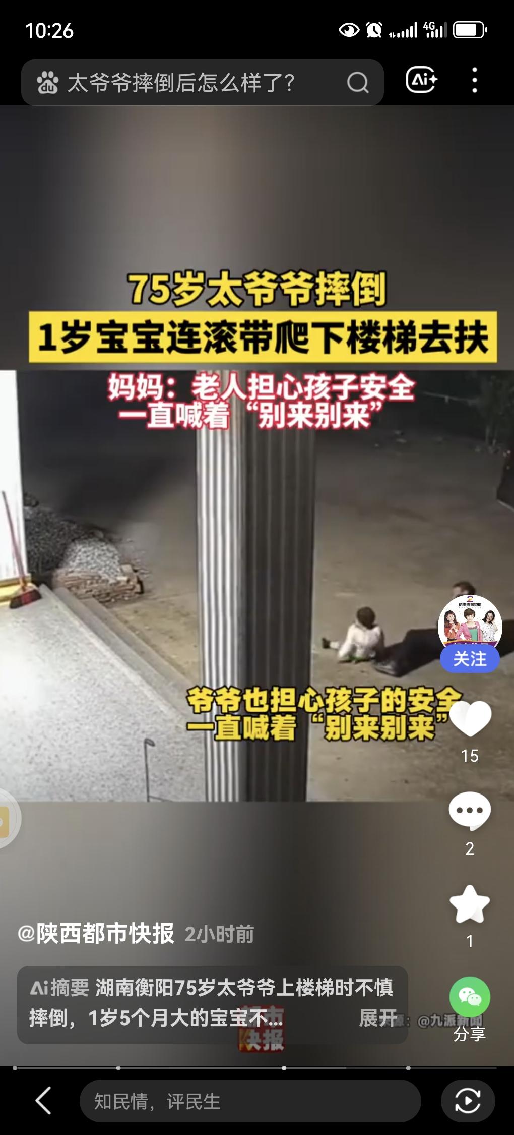 或许,这就是隔代亲,怎么也没有想到1岁五个月的宝宝,为了扶起自己的太爷爷那是连滚带爬的往太爷爷的身边跑。 事情在湖南的衡阳,75岁的太爷爷在上楼梯的时候摔倒了,因为患有高血压,在回房间的时候,在楼梯中不慎摔到在地,家人都在屋里。只有小宝贝在门外看见太爷爷摔倒了,这把她着急的不行,从孩子的母亲得知,孩子刚学会走路,还走不稳,那两阶楼梯那是一点也不敢下,看到太爷爷摔到那也是着急,连滚带爬的跑到爷爷身边拉着太爷爷的手。太爷爷也是一直担心孩子,让她别来别来。 后面是一家人发现不对后,一同出来扶起老人。 真为孩子的勇气感到骄傲,在太爷爷心中想这孩子跟个小大人一样。