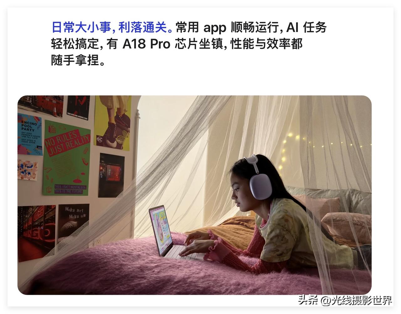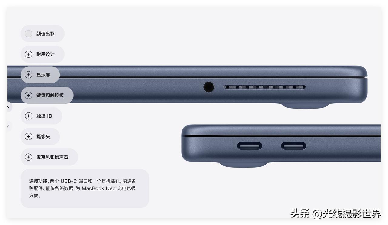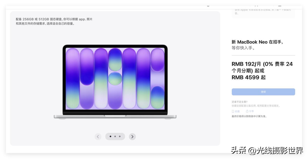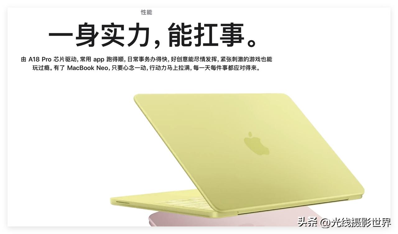 最便宜的苹果电脑来啦!256GB的Macbook Neo,起售价只要4599元!512GB版本也只要5299元!说实话,怎么感觉比起iPad搭配键盘还要便宜啊!没有办法,苹果ipad的键盘,真的太贵了! 搭配苹果键盘的苹果ipad……貌似还是不如Macbook Neo更适合打字和真正的办公啊! 所以,我个人还是非常看好Macbook Neo…… 对于经常旅行的人来说,携带一个Macbook Neo,真的胜过携带一个ipad…… 嗯,旅行途中,还时不时要处理一下工作或者文档的人来说……对于经常需要在旅行途中打字的人来说…… 好吧,最后,Macbook Neo,仅仅只是A18 Pro CPU……说实话,这个CPU,好像不如M1还是M2还是M4M5?具体我也不是太清楚……性能肯定是比较一般般的……不过,对于这个定位的人来说,应该也是绰绰有余的…… 总体来说,Macbook Neo,胜过ipad搭配一个苹果键盘……这是肯定的! ipad,最好不要搭配苹果键盘使用! 如果想要给ipad搭配一个苹果键盘,不如直接买个Macbook Neo…… 这就是我的建议和态度! 光线摄影世界曾兰谈天说地