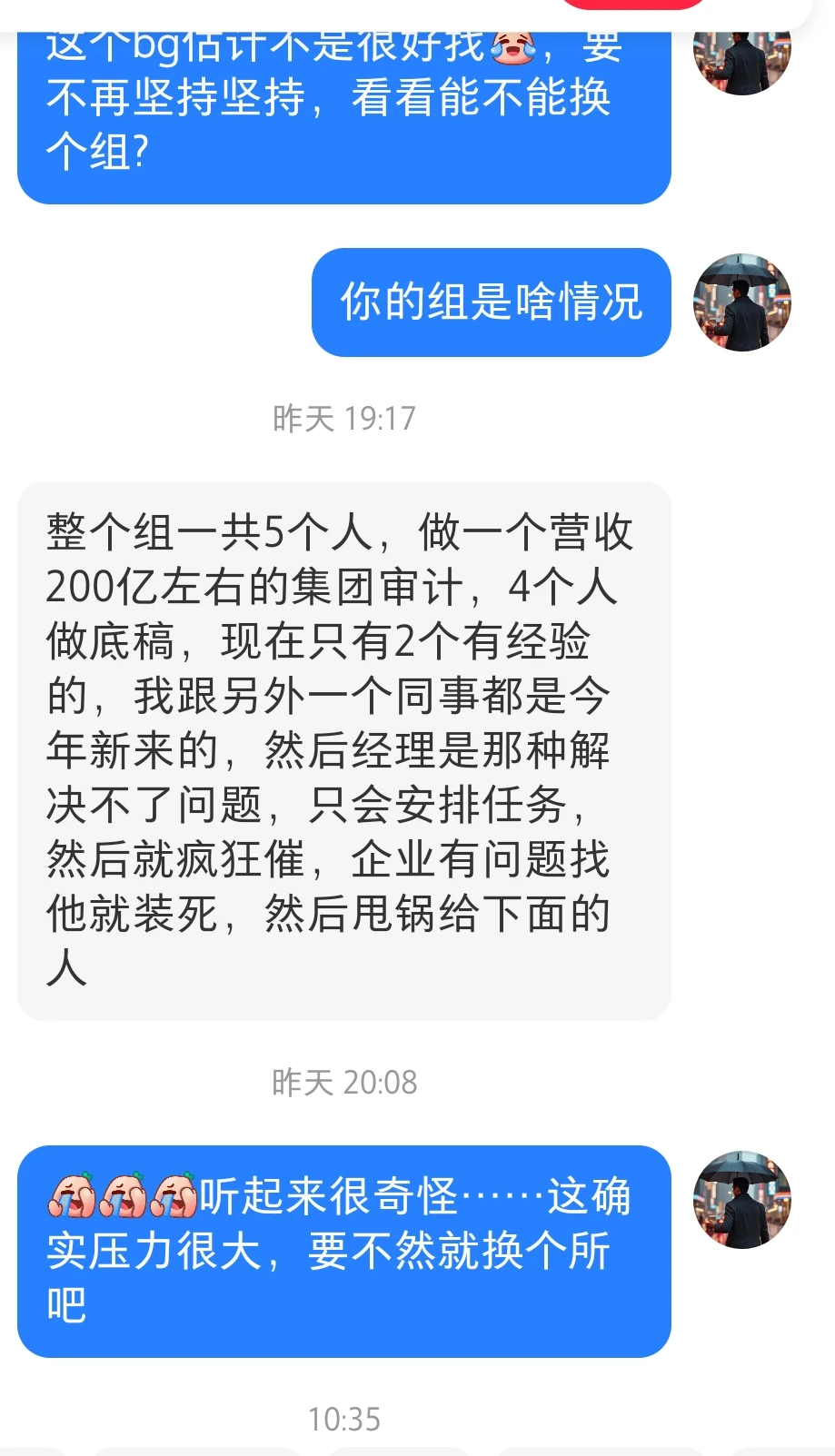 老师您好,想咨询一下,本科三本双非财经硕,25年毕业,已经通过了CPA专业阶段,以前对四大非常憧憬,现在干了4个月已经不想干了,想年后离职换财务工作,但是看了一下boss,财务的工作好像也很基础,工资也不高,怕在财务干几年上限很低,不如在审计干几年然后跳槽,但审计真不是人干的,遇到不负责任的IC更是,想听听老师的建议[石化R][石化R]