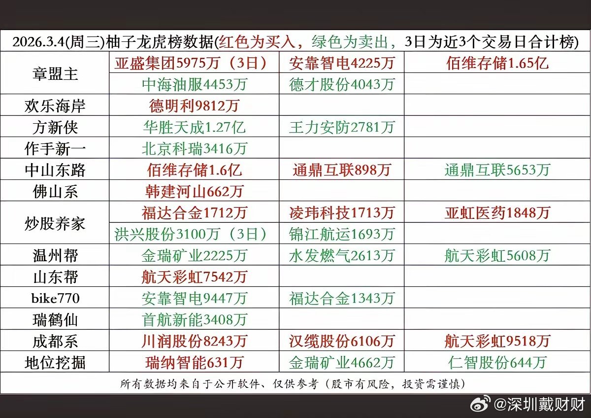 3.4周三 炸裂!游资龙虎榜重磅出炉,顶级大佬疯狂扫货,全是妖股大本营!3月4日盘后龙虎榜彻底炸场!这里全是市场最狂暴的人气标的,主力资金疯狂博弈,振幅冲天、换手爆表、人气碾压全场,每一只都是短线资金疯抢的王炸选手!这是游资大佬的主战场,是妖股诞生的摇篮!跟着顶级资金的脚步,就是跟着主升浪吃肉!记住核心铁律:快进快出、杀伐果断,买在起爆点、卖在高潮时,节奏踩准,利润狂飙;节奏一错,立马退场!今晚紧盯龙虎榜,明天坐等大肉!