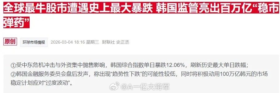 韩国砸100万亿韩元。稳定市场。这太牛逼了。大约4700亿人民币,不要以为这个很少,韩国股市总市值现在不到20万亿总市值,很显然明天韩股市可能要稳定了。那么接下来A股怎么走,今晚8点头条直播,咱们聊聊。。。