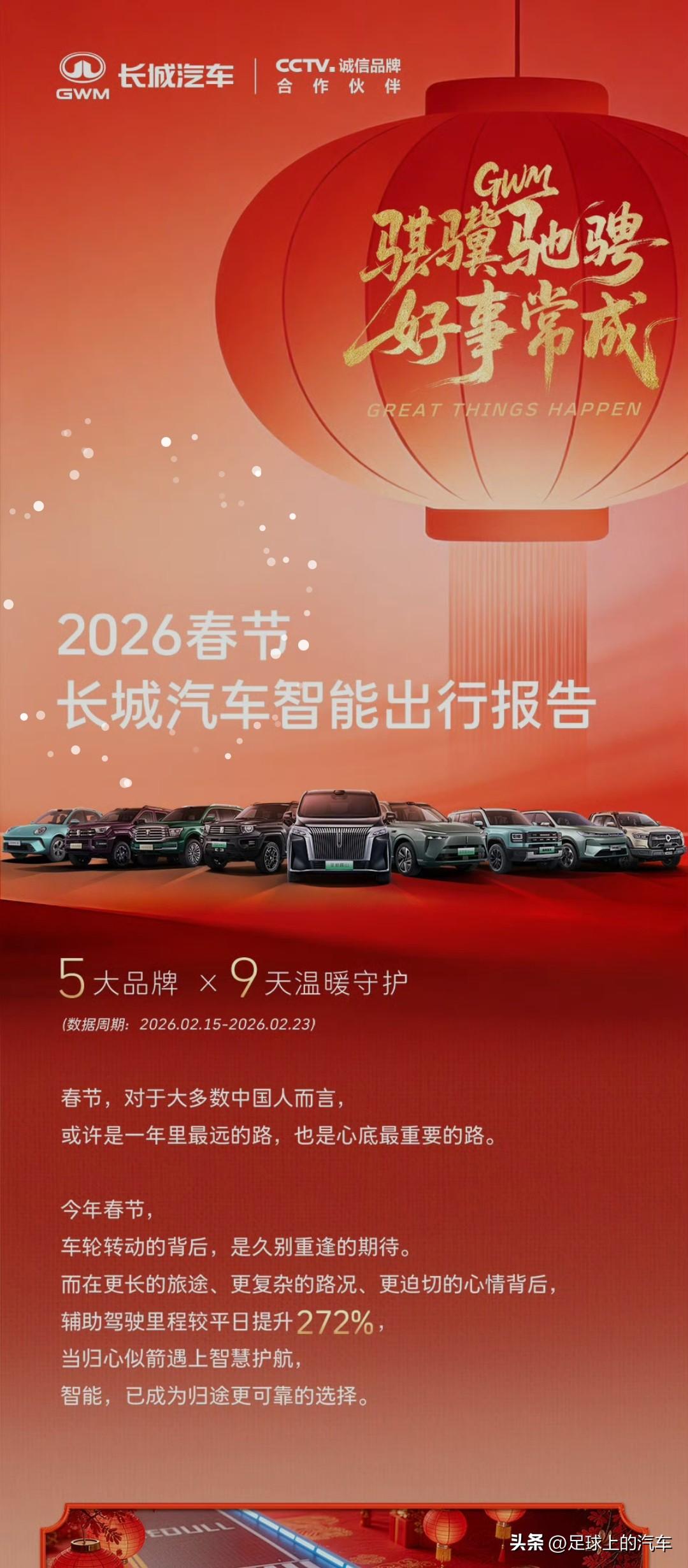 很少见魏建军发微博图文,今天这是闹哪一出? 原来今天魏建军,晒出了春节期间长城汽车的智驾成绩单:辅助驾驶总里程4229.9万公里,里程时长同比暴涨400%,1046万次车机点亮。 看看长城春节智驾成绩单有多能打,这数据背后,是无数家庭的团圆路被稳稳守护着~ 最后魏建军还表示,感谢大家愿意把方向盘交给长城汽车。 魏建军的这份清醒和责任感,真的很圈粉。