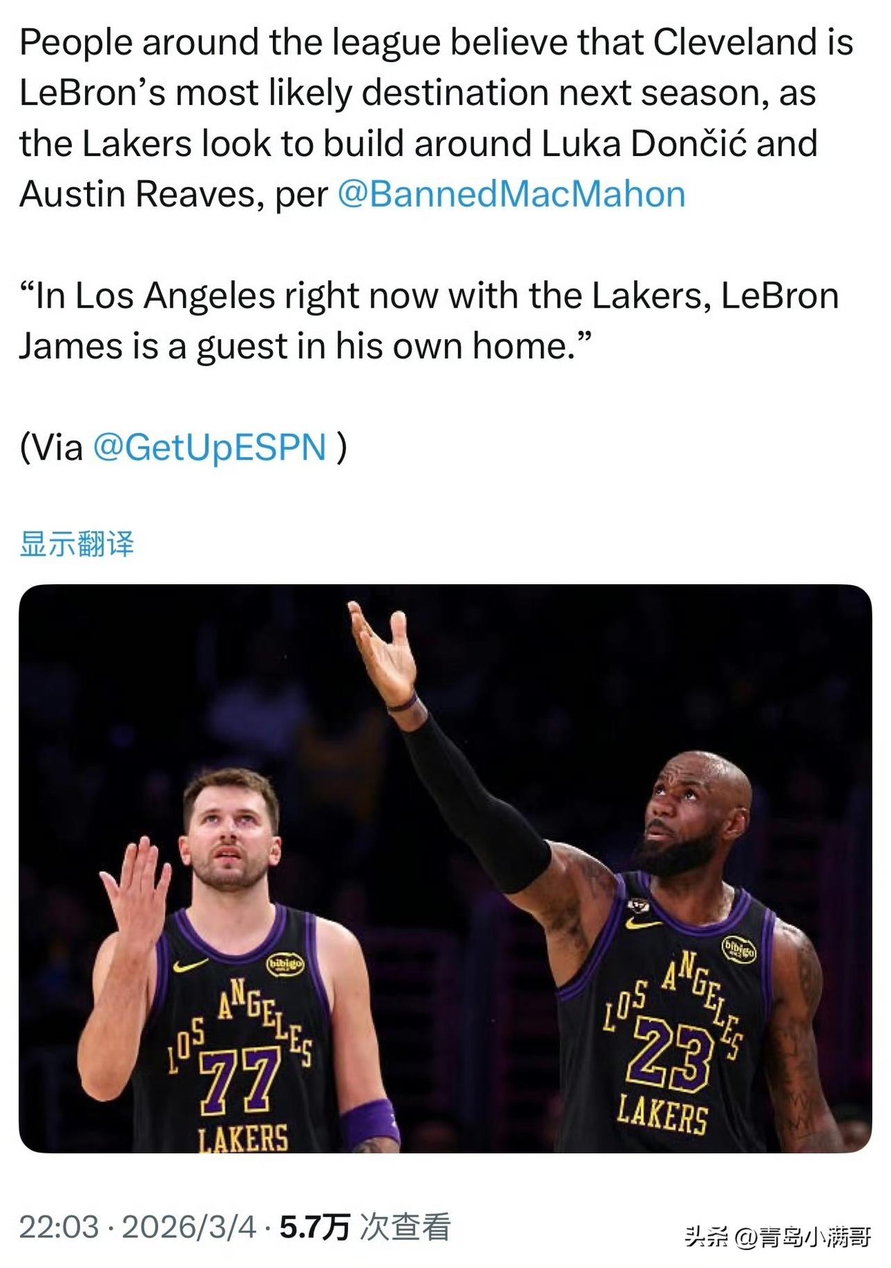 骑士是詹姆斯下赛季最可能的下家豪华混动MPV进入19万时代 根据外媒ESPN记者Tim Macmahon最新消息透露:联盟内部人士普遍认为,骑士是詹姆斯下赛季最有可能的下家。 看来也是铁了心让詹姆斯离开湖人了,该记者表示湖人目前是东契奇和里夫斯的球队,球队将围绕他们两个组建新的阵容,詹姆斯目前的地位很尴尬,在洛杉矶他就像一个客人一样。 距离休赛期越来越近,詹姆斯离开湖人的消息也是越来越多,湖人管理层并没有想要留在詹姆斯,除了东契奇和里夫斯主动向管理层施压。 今夏湖人还要优先续约里夫斯,然后争夺字母哥,最后可能才是考虑詹姆斯。湖人 詹姆斯 东契奇