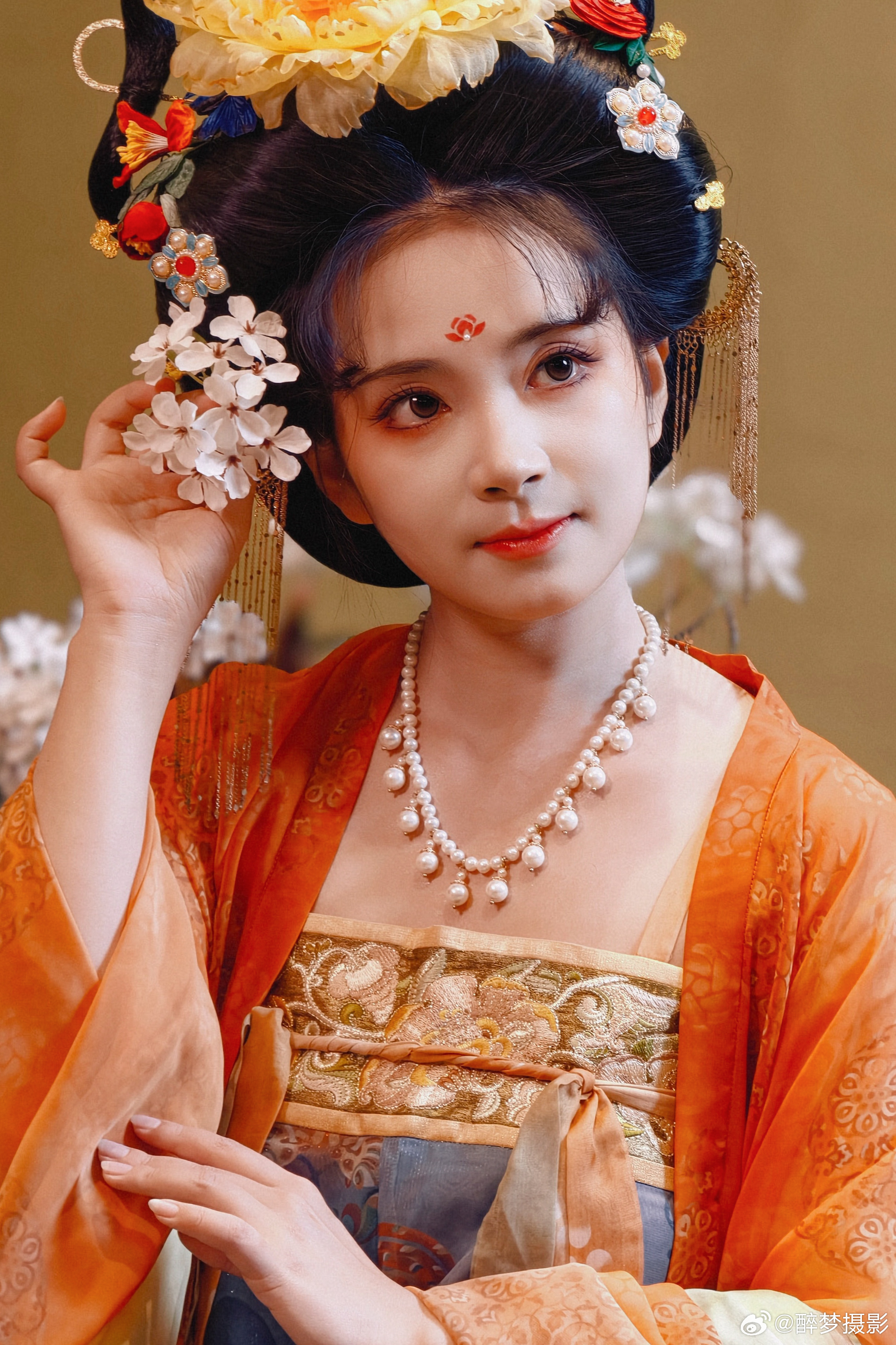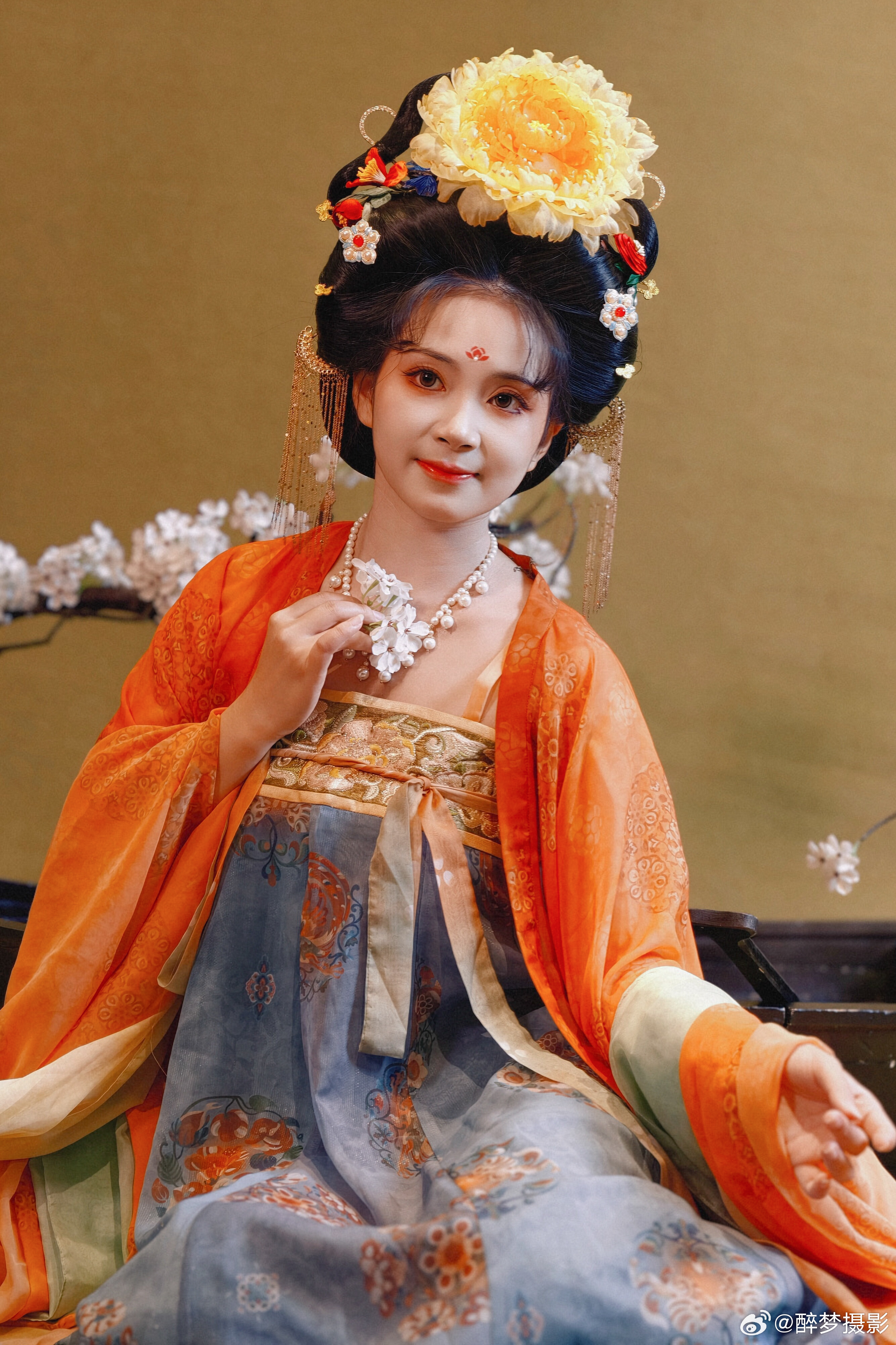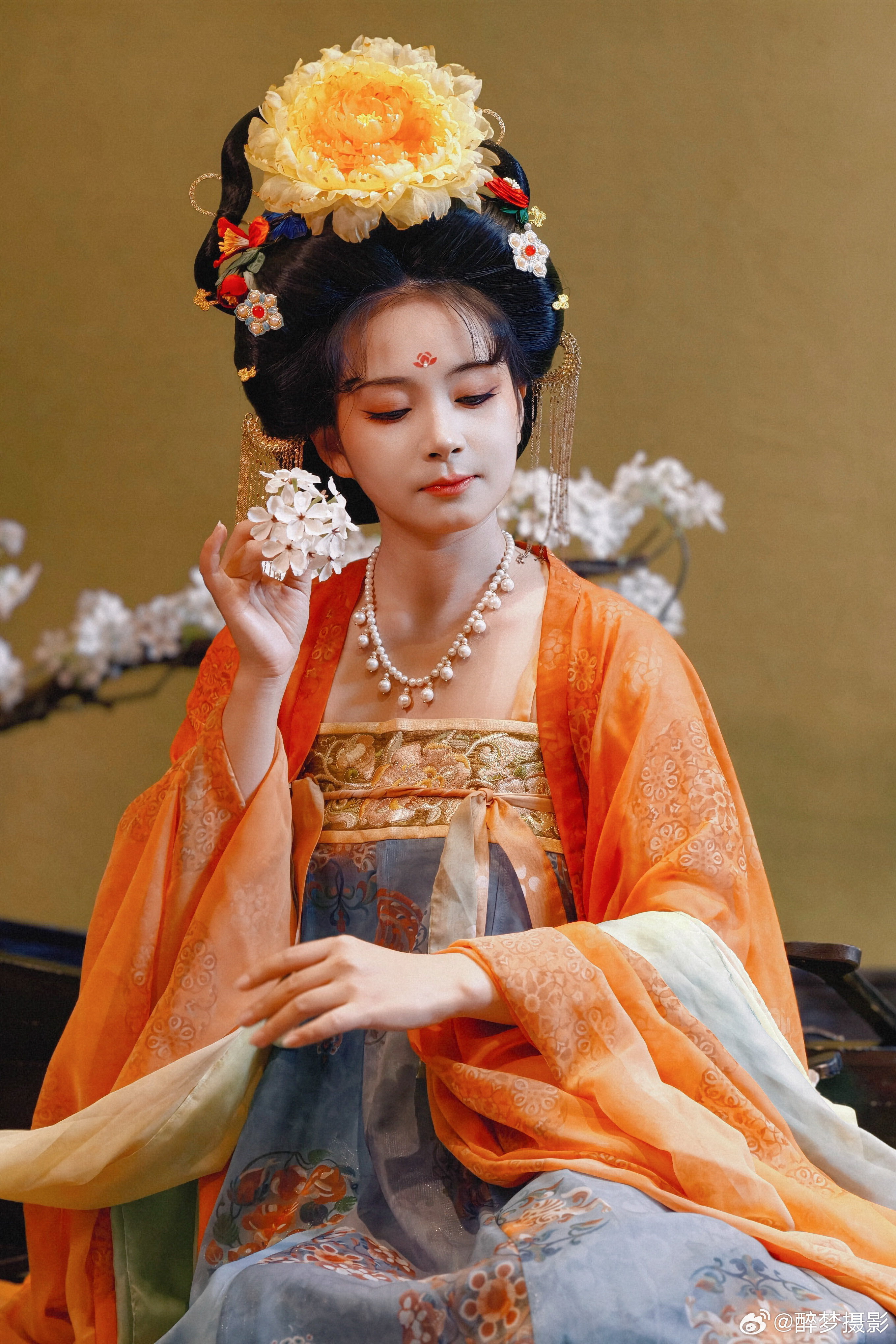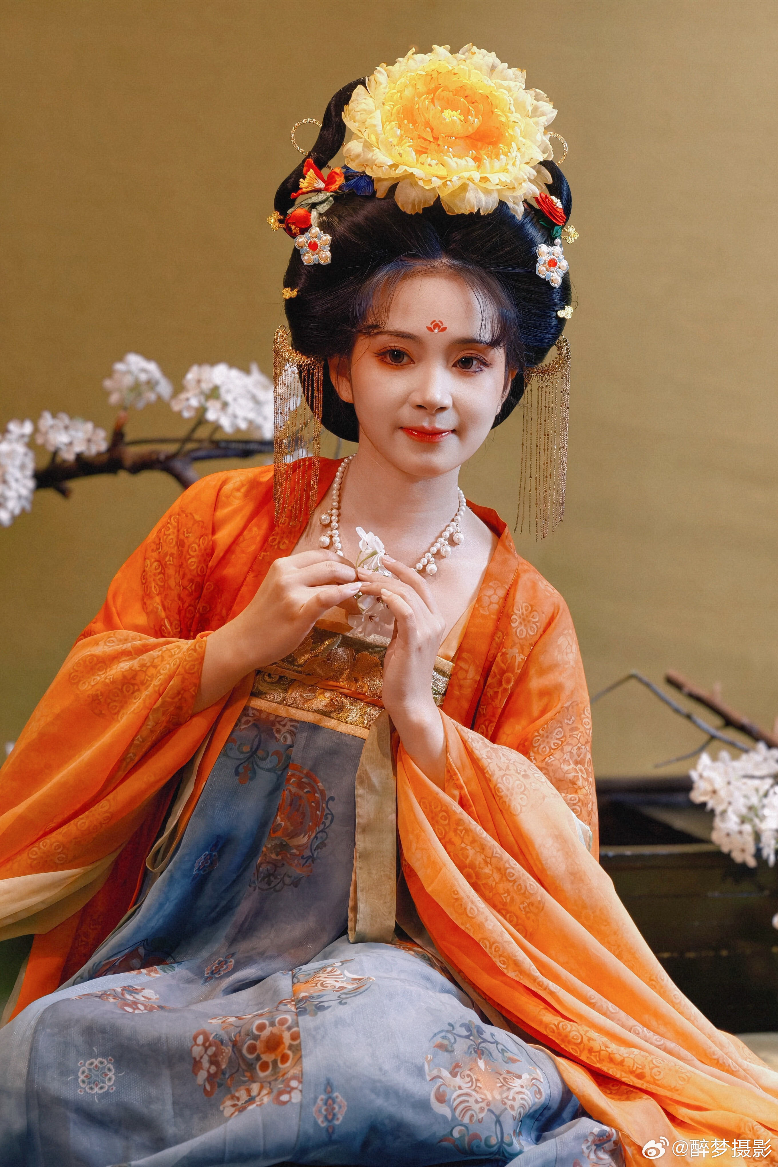 古韵今风,一袭华裳醉千年。 橙蓝相映,花钿步摇,尽显盛唐风华。 执花浅笑,眉目如画,仿佛从壁画中走来的仙子。