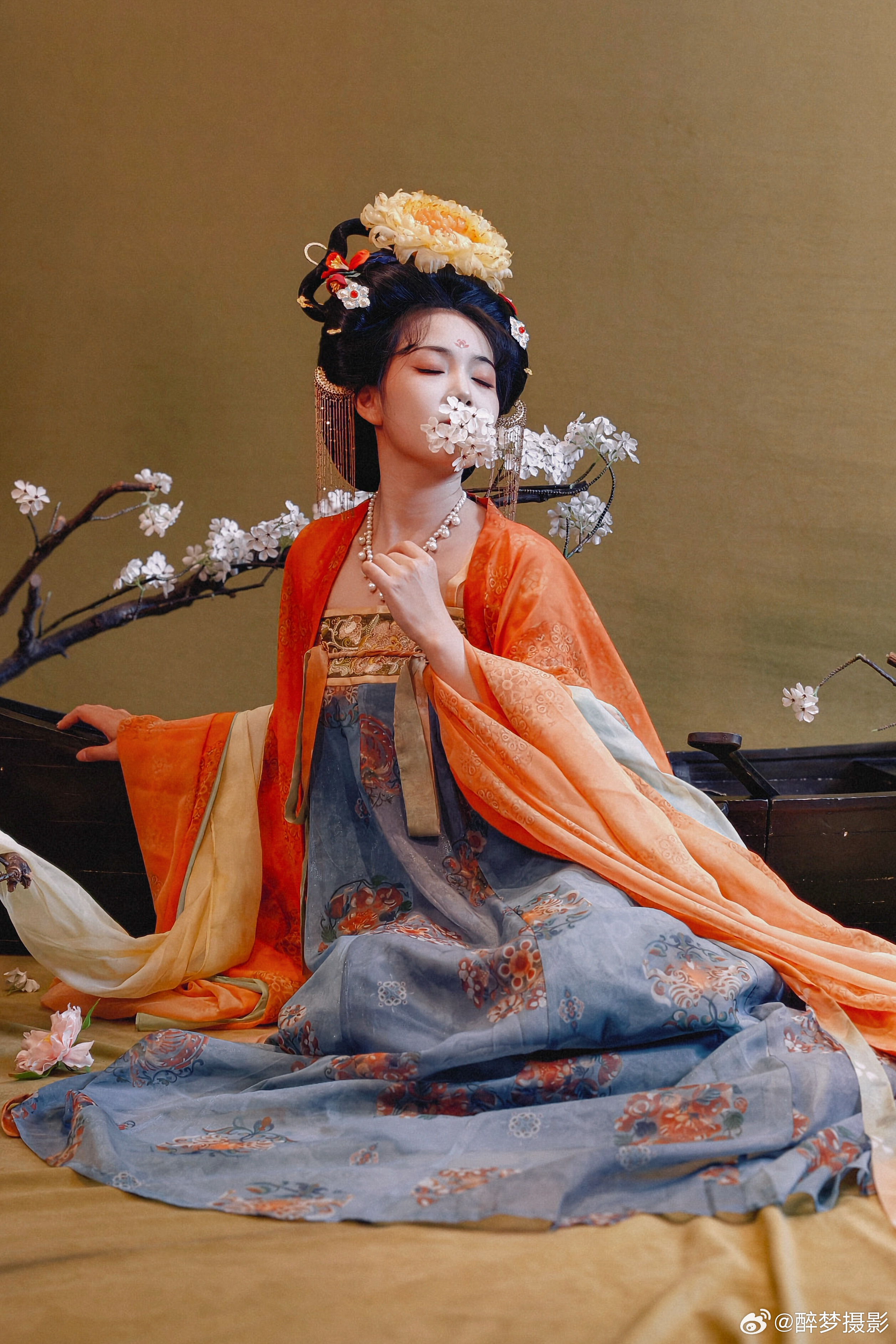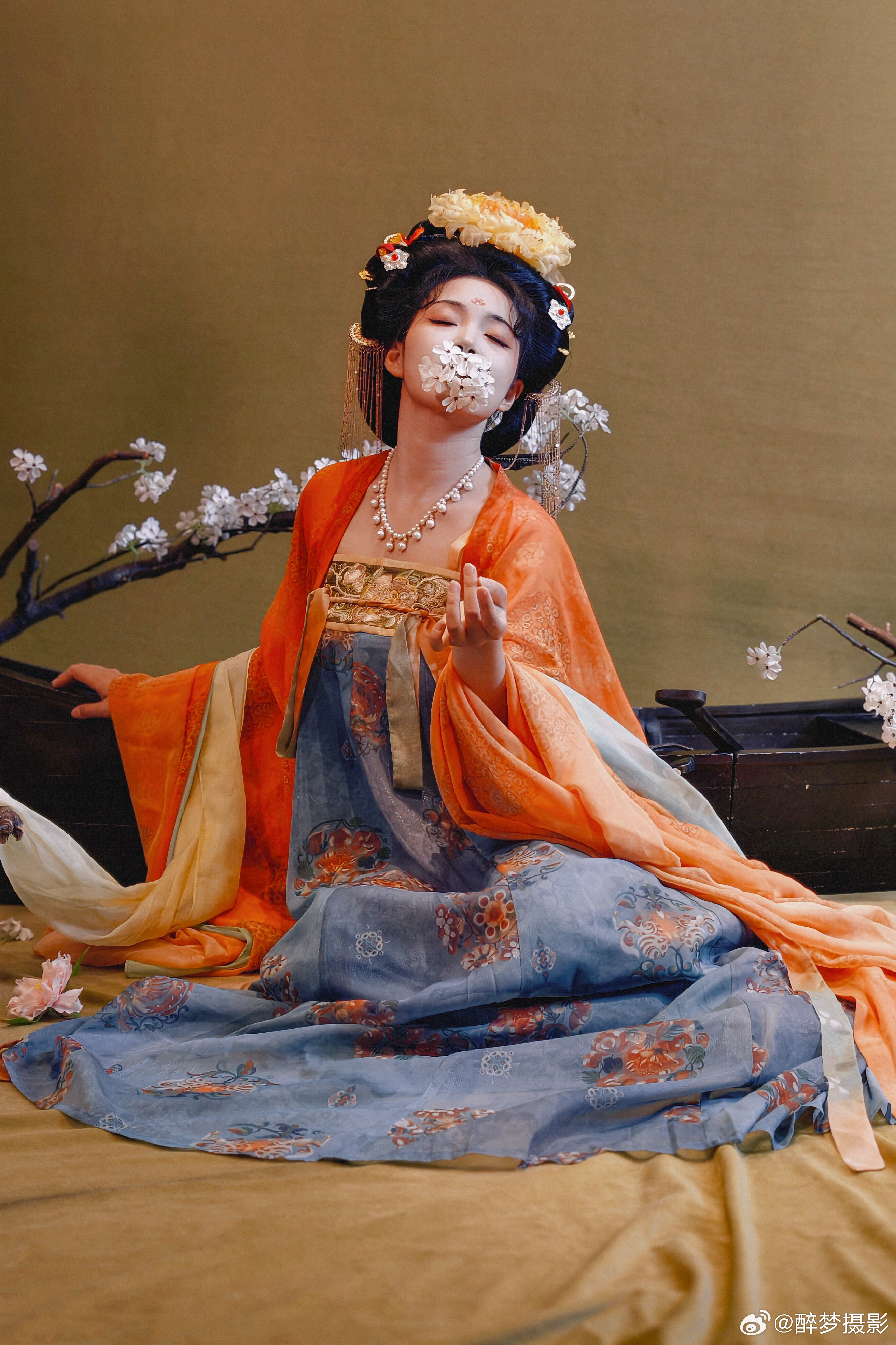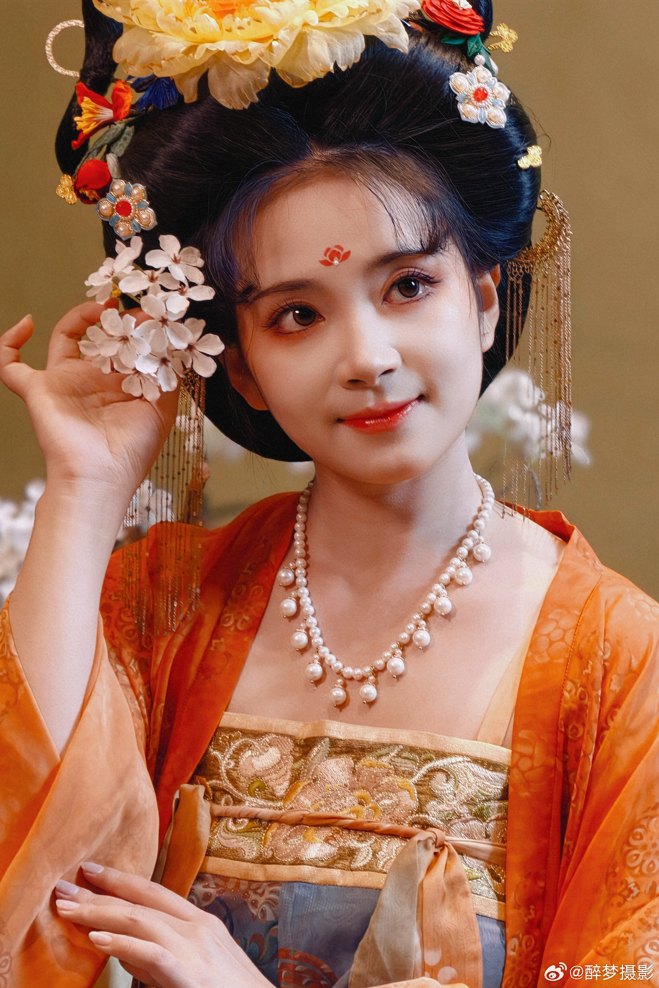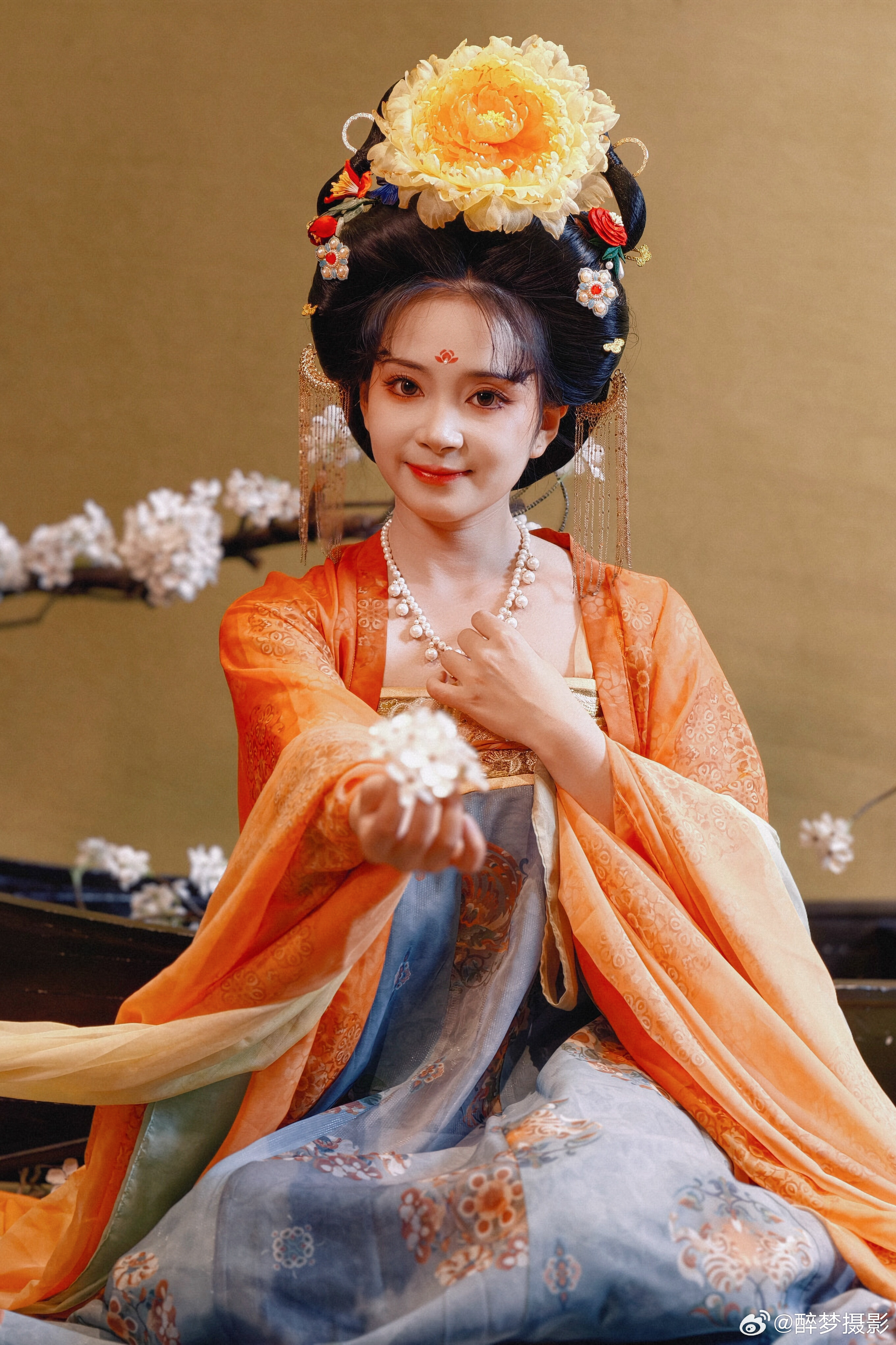 古韵今风,一袭华裳醉千年。 橙蓝相映,花钿步摇,尽显盛唐风华。 执花浅笑,眉目如画,仿佛从壁画中走来的仙子。