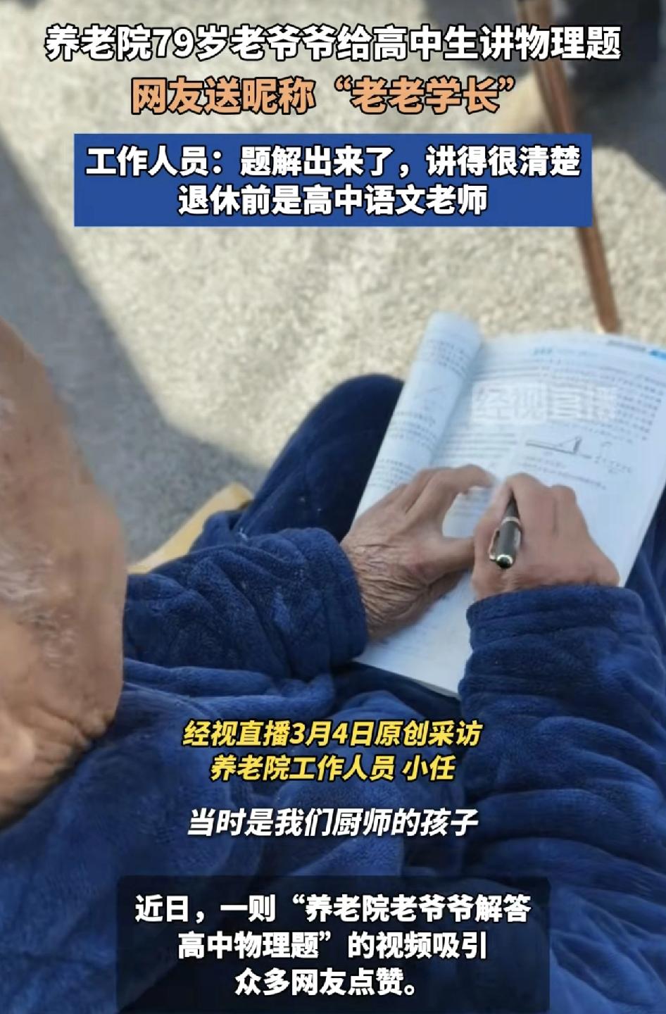 郑州一家老人院一位79岁的爷爷为养老院厨师的孩在读高中的孩子讲解物理题,当时工作人员只拍了前面段视频就被叫忙别的事情去了。这位老爷爷退休前是一位高中的语文老师,虽然教的不是物理,但是他依然接过孩子的题目慢慢的讲解,题最后解出来了,讲的特别清楚,这也引发了很多网友们的点赞,不少养老院的老人其实都有自己的兴趣爱好甚至是特长,能够帮助身边的人,对于他们来说既能帮到人更能丰富平时的生活。