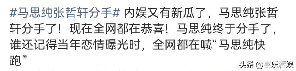 马思纯,正式官宣! 3月5日,一向低调的女星马思纯,突然冲上了热搜,原因是她正式官宣了一件事,看的网友们一片欢呼声,直呼太好了! 原来,马思纯在杨天真的播客中,亲口承认了自己单身的状态。 言外之意,也就是说,她已经和张哲轩分手了。 据了解,马思纯和张哲轩是在2021年被拍到一起回家,恋情从而曝光。 然后在2022年8月份的时候,两人正式官宣在一起,之后也有八卦媒体拍到他们在街头拥抱的甜蜜画面。 至于和张哲轩什么时候分开的,马思纯并没有说,她表示自己目前单身的状态很舒服。 马思纯还表示:后面要是再选择谈恋爱的话,她不会考虑在一起一两年就散的感情。 现在的她,更趋向于能稳定、能走向婚姻的感情。 说起来,马思纯当时和张哲轩在一起的时候,网友们就不看好,不管从颜值还是事业,两人都不搭。 事实证明,网友们的眼光还是挺毒辣了,以至于看到马思纯正式官宣自己单身状态这个消息时,网友们都开心的一片欢呼声。