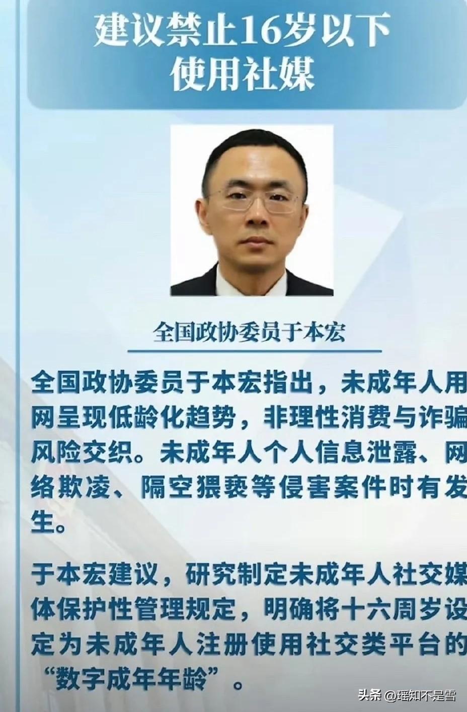 今年两会期间,全国政协委员于本宏提出的一项建议,一下子戳中了无数家长的痛点,也在网上吵翻了天。 他建议,禁止16岁以下未成年人使用社交媒体,初衷是保护孩子远离网络沉迷、网络暴力和不良信息,还给青少年一个更纯粹的成长环境。 这条建议一出,立刻引发全民讨论,有人拍手叫好,也有人觉得太过极端。 于本宏委员常年深耕未成年人网络保护领域,连续多年调研中小学用网现状,接触过上千名家长与学生,还对照过澳大利亚、欧盟等国家和地区的相关立法,这份建议绝非凭空提出。 我国未成年网民规模已突破1.96亿,互联网普及率高达97.3%,社交平台占据了孩子绝大多数上网时间,这组数据背后,是无数家庭的真实困境。 我身边有位妈妈,上五年级的女儿每天放学就抱着手机刷短视频、聊同学群,作业拖到深夜,视力从5.0降到4.2,因为在社交平台被同学起外号、发丑照,连续两周不敢去学校。 还有家长发现,孩子偷偷用长辈身份信息注册账号,打赏主播、跟风网购,几千元零花钱转眼花光,这些藏在屏幕里的伤害,看不见摸不着,却一点点啃噬孩子的身心。 支持禁令的家长,心里装的都是实打实的无力感。他们看着孩子被算法牵着走,刷着碎片化的低俗内容,模仿网络上的偏激言行,放弃了看书、运动、和家人聊天的时间。 他们怕孩子陷入信息茧房,三观被不良信息带偏;怕孩子遭遇网络诈骗、隐私泄露,留下终身隐患;怕网络暴力击穿孩子的心理防线,变成无法愈合的伤疤。 在他们看来,一刀切的禁止,是最直接的保护,哪怕手段强硬,也比眼睁睁看着孩子受伤要好。 反对的声音同样站得住脚。教育从业者和清醒的家长都清楚,16岁以下是孩子建立数字认知的关键期,完全切断社交媒体,等于把孩子隔绝在数字时代之外。 现在的校园生活早已和线上社交绑定,同学分享学习资料、讨论校园活动、联络感情,都离不开社交平台。 强行禁止只会让孩子和同龄人脱节,好奇心还会驱使他们偷偷用账号,避开监管接触更危险的内容。 现实层面的执行难题更无法回避,平台实名核验有漏洞,孩子用家人信息就能注册,家长不可能24小时紧盯,学校也管不了课余生活,一纸禁令很难真正落地。 于委员的建议,精准戳中了社会对未成年人网络保护的集体焦虑,却忽略了数字时代的现实逻辑。 保护孩子从来不是一禁了之,而是要搭建家庭、学校、平台、社会联动的防护网。平台该扛起主体责任,严格落实青少年模式,关闭个性化推荐,禁止夜间推送,拦截不良信息。 学校要开设网络素养课,教孩子辨别信息、保护隐私、应对暴力;家长更要放下手机,用陪伴填补孩子的精神空缺,而不是把监管责任全推给禁令。 于委员同时提出建设无商业推送的青少年专属数字空间,这才是更可行的方向,既满足孩子的社交与学习需求,又能规避风险。 网络本身没有对错,关键在于如何引导。我们不该把孩子关在没有网络的真空里,而是帮他们练就抵御风险的能力,让他们在数字时代安全成长。 各位读者你们怎么看?欢迎在评论区讨论。