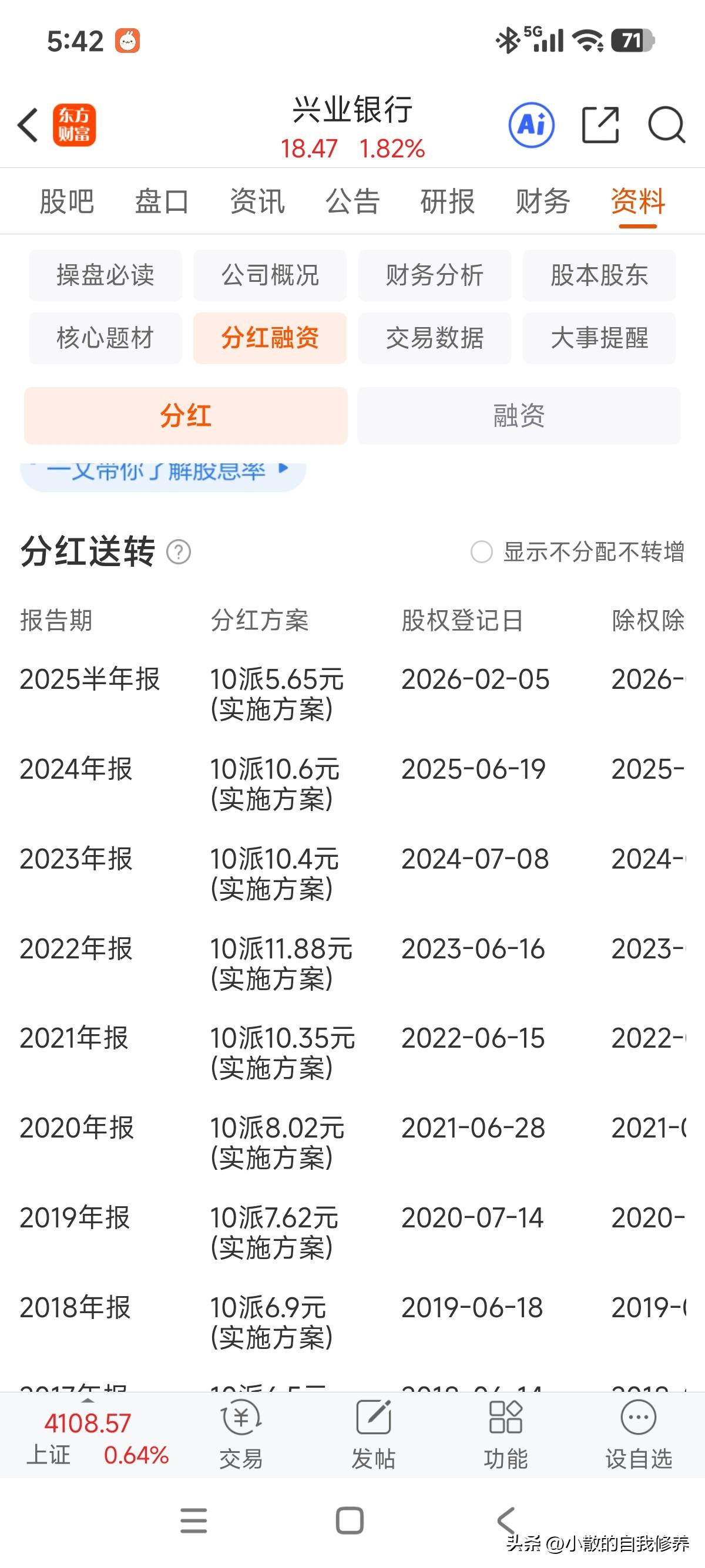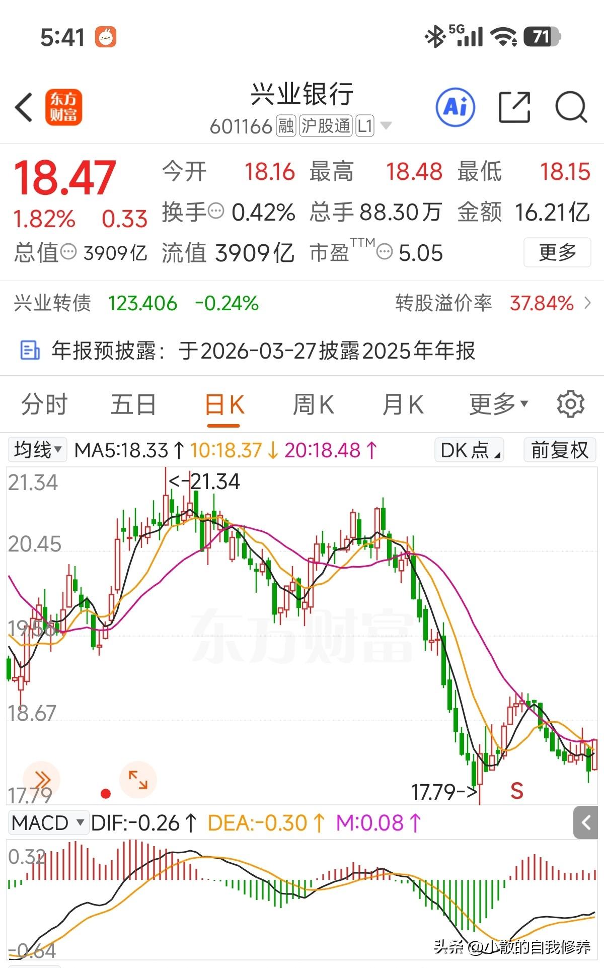 太熟悉的节奏了,持股期间年每股分红8毛不到见到过这价格,每股分红1.18元时候也见过这价格!去年一路上冲时以为兴业18时代一去不复返了!终究还是回来了! 奇怪的虽然不少短线单过早冲进去套着,但到这价位没有任何失落感觉,相反因为太熟悉了,淡定得很!另外日线MACD有个底背离,看下能否发起一波反弹!