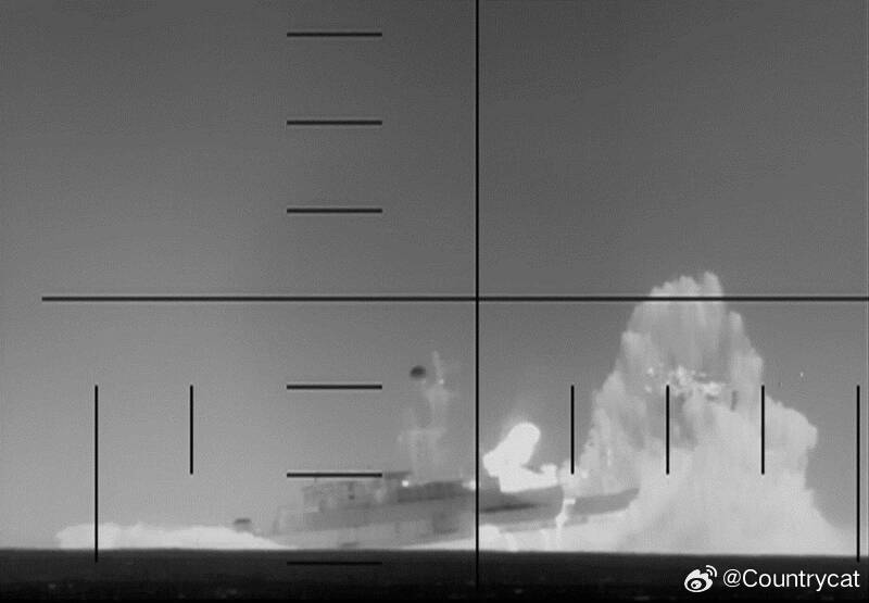 图:美国国防部公布的潜望镜画面显示,美军潜舰鱼雷在斯里兰卡外海击中伊朗巡防舰「德纳号」瞬间。 (法新社)