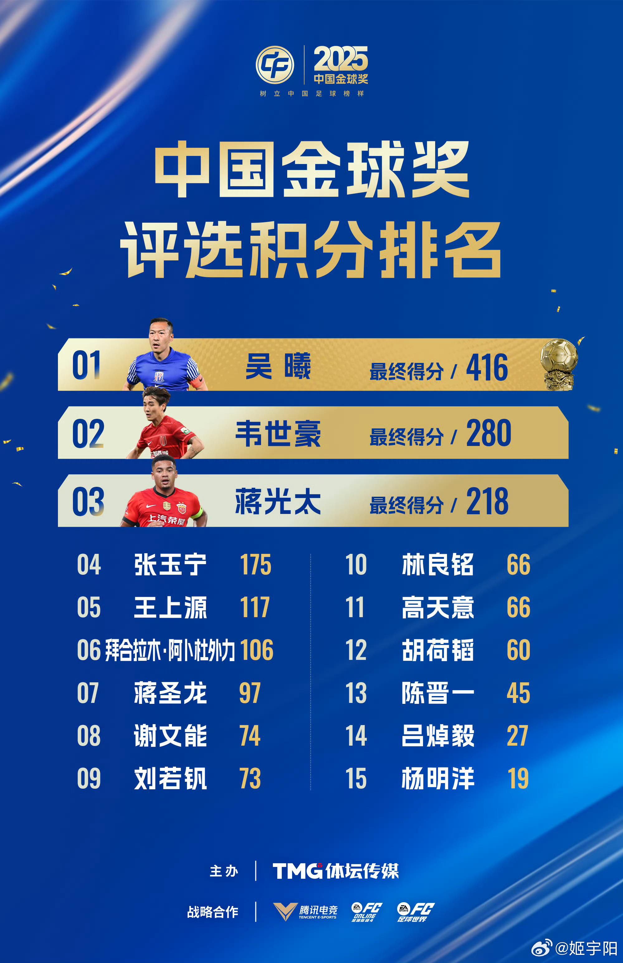 2025中国金球奖所有候选人的评选积分已经公布。3月2日,第九届中国金球奖颁奖仪式在南京落下帷幕。上海申花队长吴曦以416分摘得中国金球奖,成都蓉城的韦世豪(280分)以及上港海港的蒋光太(218分)分列第二和第三位。据了解, 2025中国金球奖 评选各奖项的最终积分及评委投票详情,也将在第934期《足球周刊》杂志予以完整公布。
