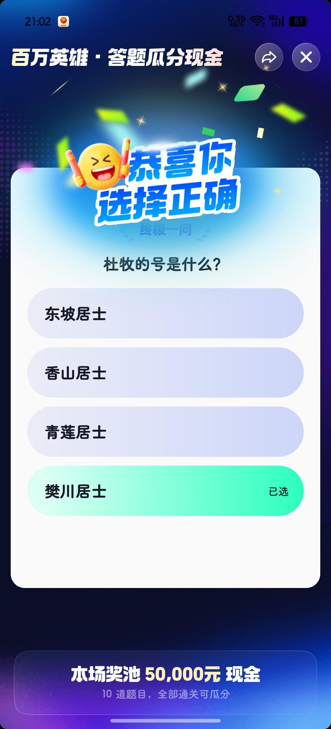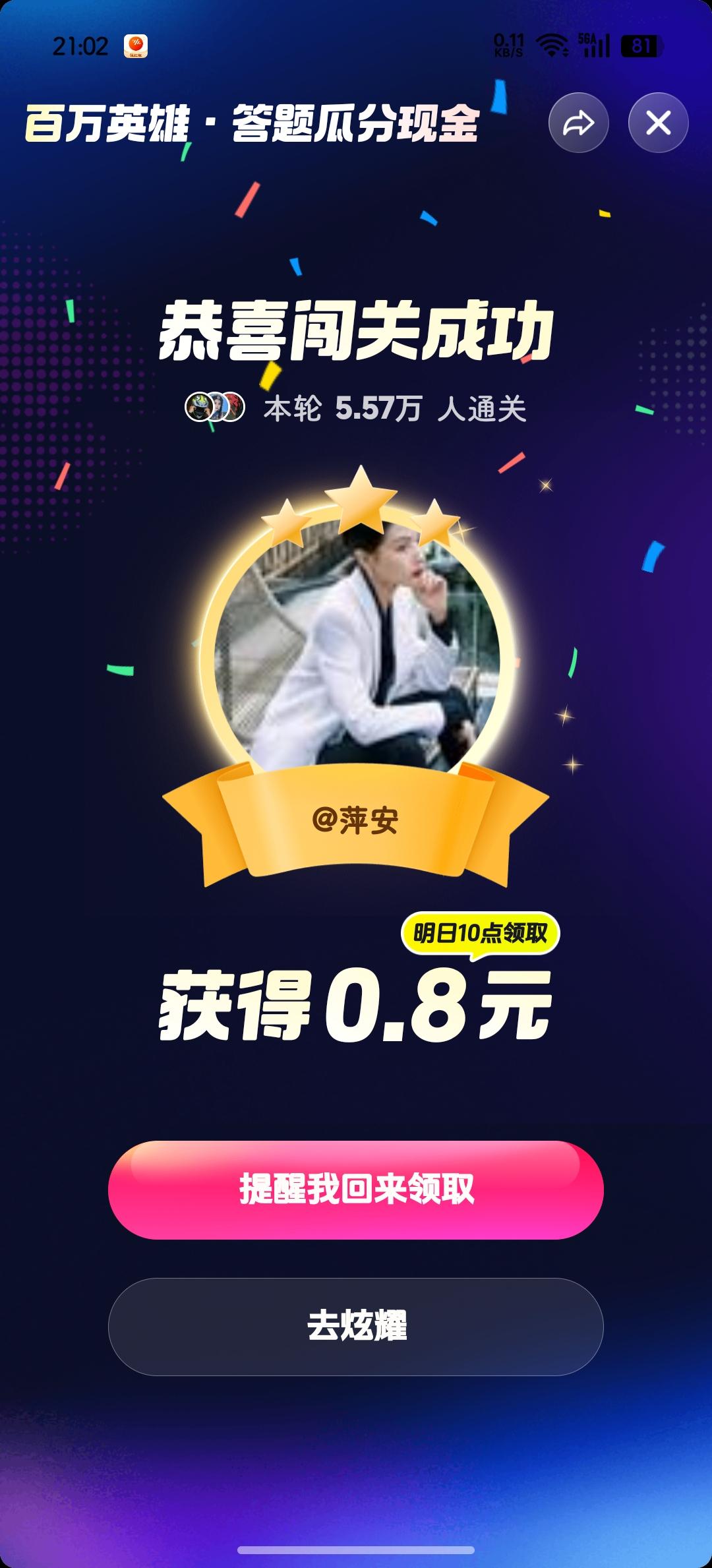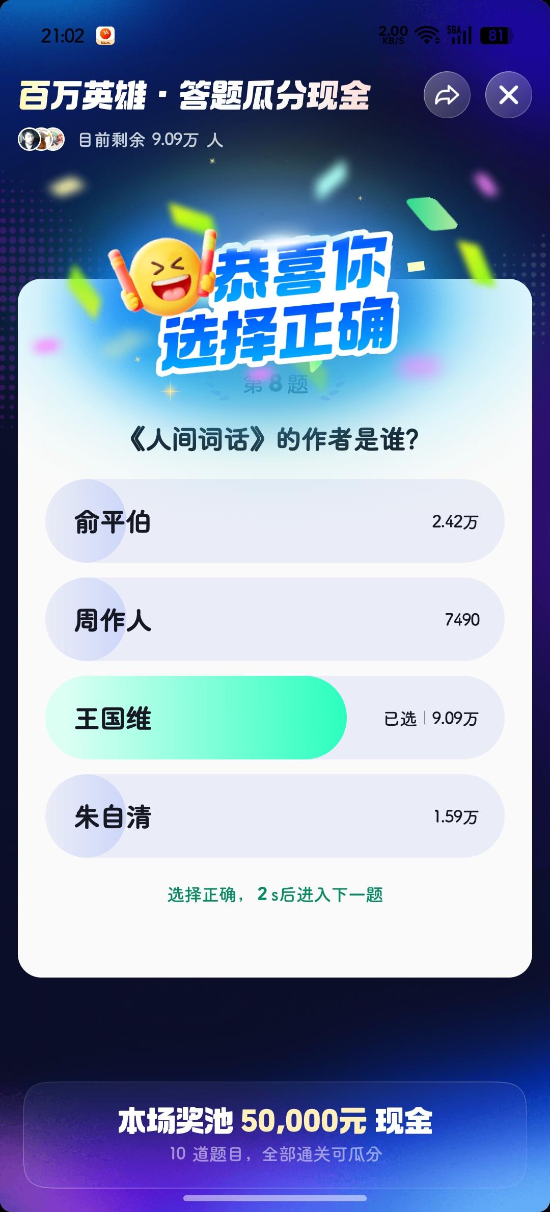 今天晚上终于答对一场了! 虽然只分得0.8元, 还是很开心❤️^_^❤️