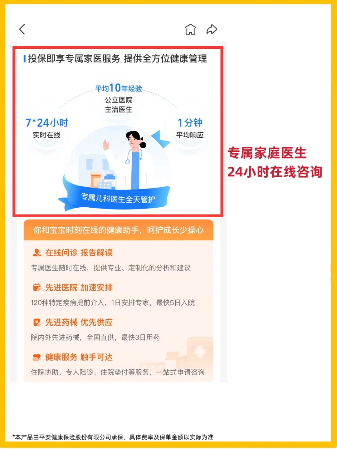🌟保单生效后立享 7×24 h专属家庭医生,随时咨询护理、病情等问题;还提供住院协助、暖心陪诊、医疗费用垫付等服务,缓解就医压力。