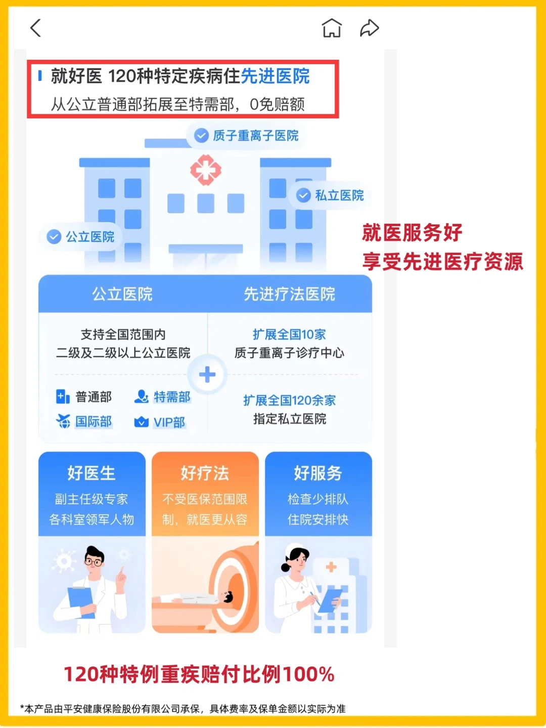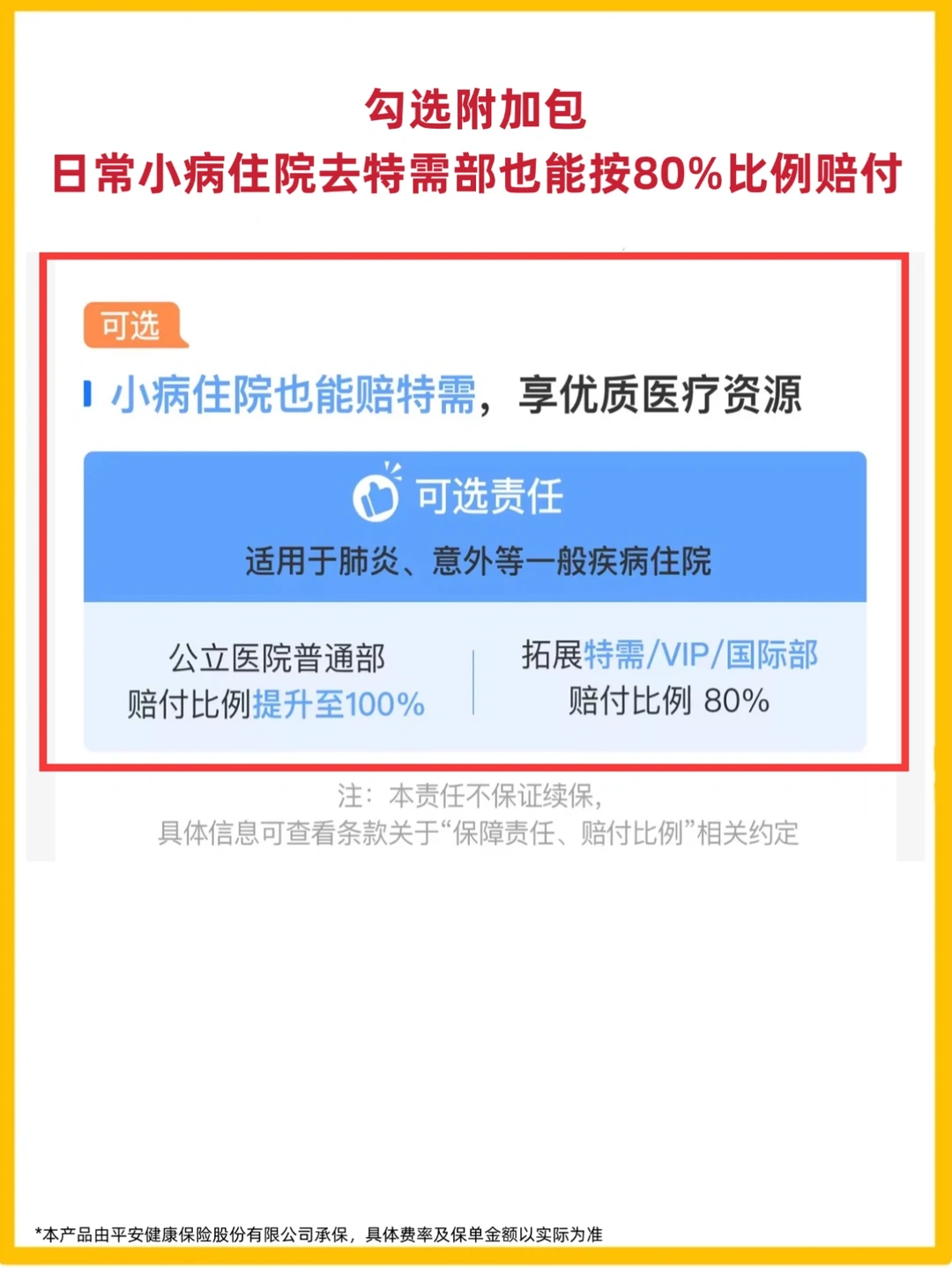 🌟针对白血病等120 种指定重疾,可申请三甲医院特需部 / 国际部及指定私立医院就诊,赔付比例 100%,享受更优质的医疗资源与就医环境。勾选拓展保障后,普通疾病也可去特需部住院治疗,赔付比例 80%