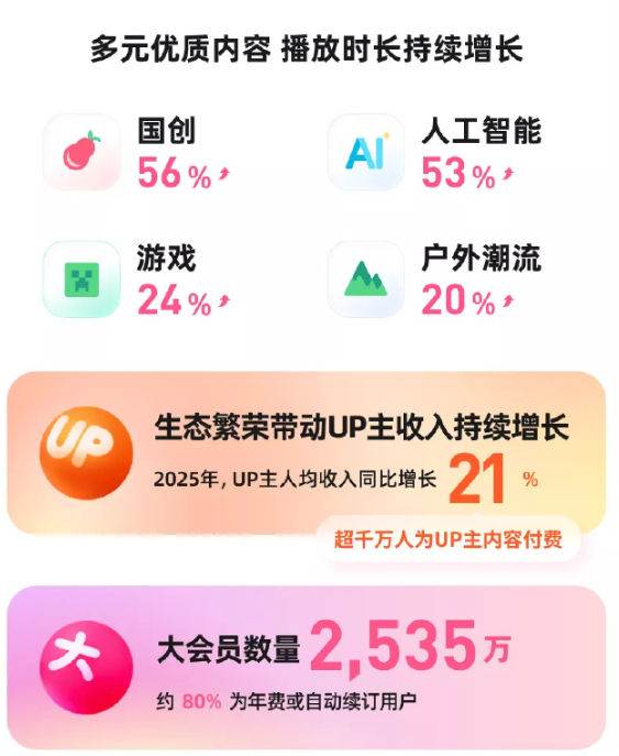 B站刚发布的2025财报,还挺超预期的,最亮眼的是“4季度日活1.13亿同比涨10%,日均使用时长107分钟同比涨了8分钟”,因为当下国内的互联网生态已经是红海,纯粹的存量竞争市场,每个人手机里该装的APP都装完了,上网时间尤其娱乐时间也已经被填的不能再满,短视频挤压下,大部分APP的日活和使用时长都在下降,B站还能逆势上涨,夺回用户注意力,这某种意义是用户的胜利,说明很多人还是能够抵抗带来短平快爽感的的短视频,且依然有热情和耐心去消费相对更深度的长视频内容,还没被短视频带来的廉价多巴胺所奴役。