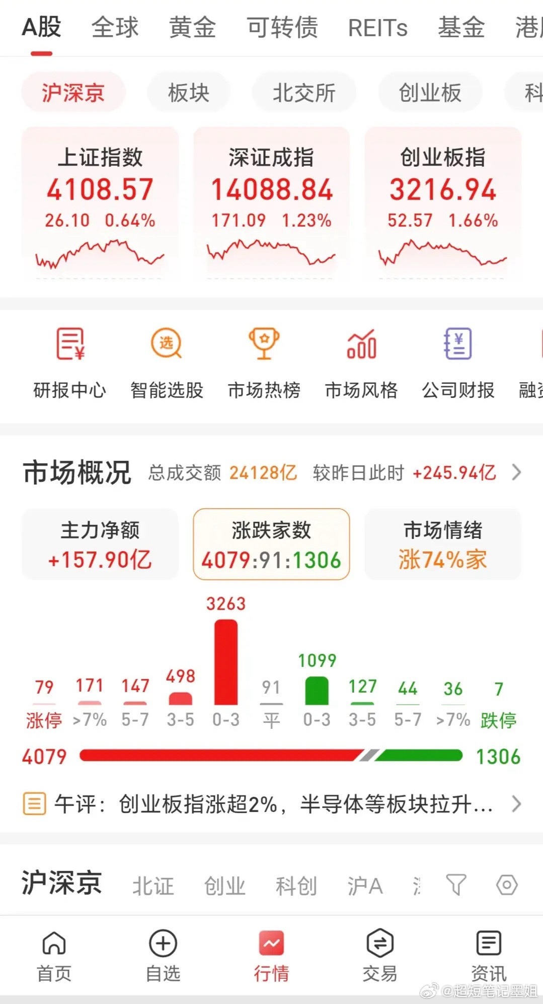 三大指数高开震荡,受假阴性,全天成交2.41万亿,放量250亿,超4000家上涨,涨跌比大于3:1,涨停79家,跌停7家,市场情绪高涨!