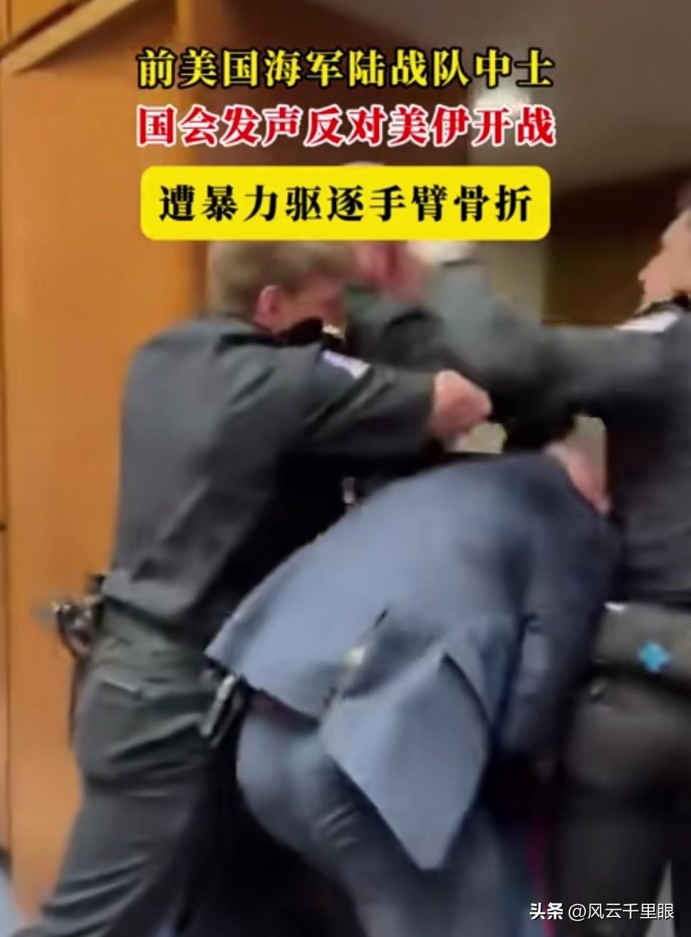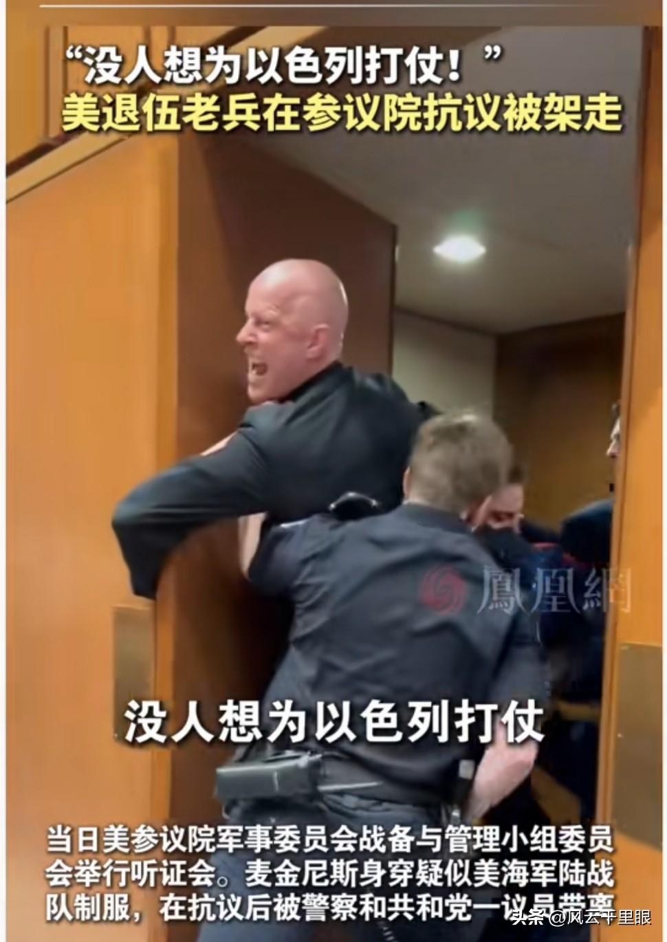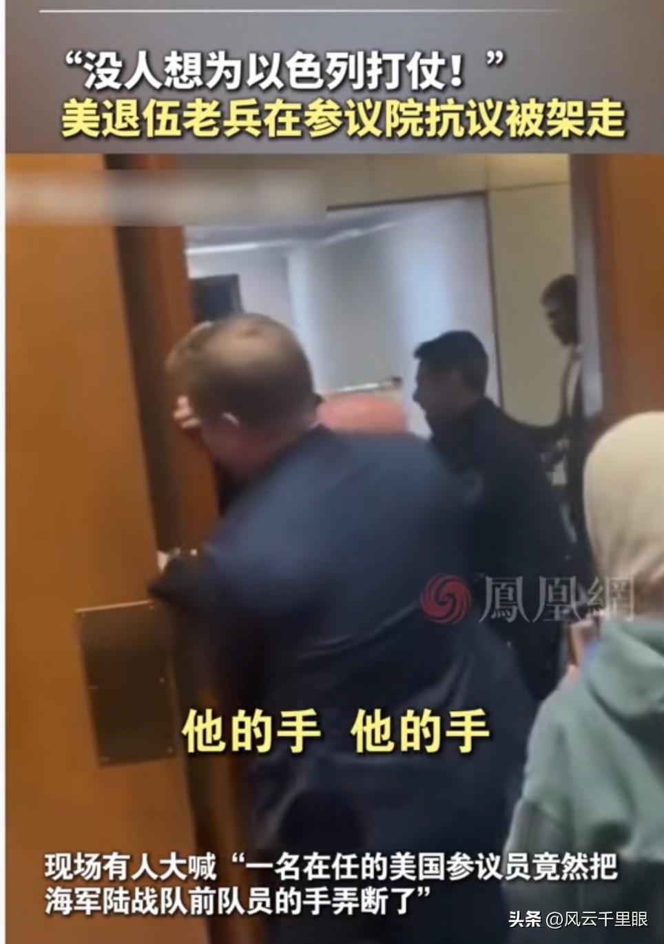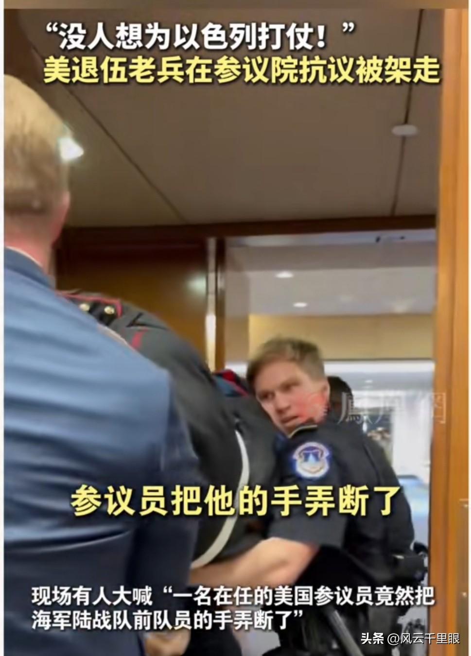【美国爱国老兵议会抗议,胳膊被折断一声不吭】 前美国海军陆战队退伍老兵大闹参议院,因其反对帮以色列打仗而被保安拖走。 大概有四五个人拉着他,他口中一直高喊不能帮以色列打仗。 但突然来了几个强壮的保安把他按倒,老兵仍然挣扎着,期间被绊倒摔在椅子上,几个人仍不停手。 老兵被拉扯着推出去,但他仍不放弃,走到门口时使劲抓着门缝。 他的手卡在门缝中,因为保安的拉扯,一声清脆的骨头断裂的声音响起,老兵没有哼一声,只是一直强调自己的诉求。 他们明明听到了,并大喊他的手断了,却并没有人停手,他扔被众人强行带走。 这就是美国的自由,一个为国付出青春的美国老兵,就这么被暴力对待。 仅仅因为不想让美国成为以色列的工具,仅此而已。 自由美利坚吗?美退伍老兵高喊没人愿为以色列而战 美国一名军人在以色列驻美使馆外自焚 有时候帝国崩塌,只需要一场错误的战争。