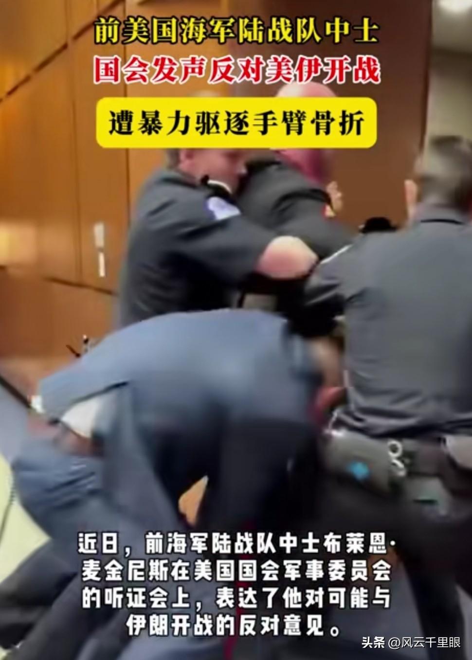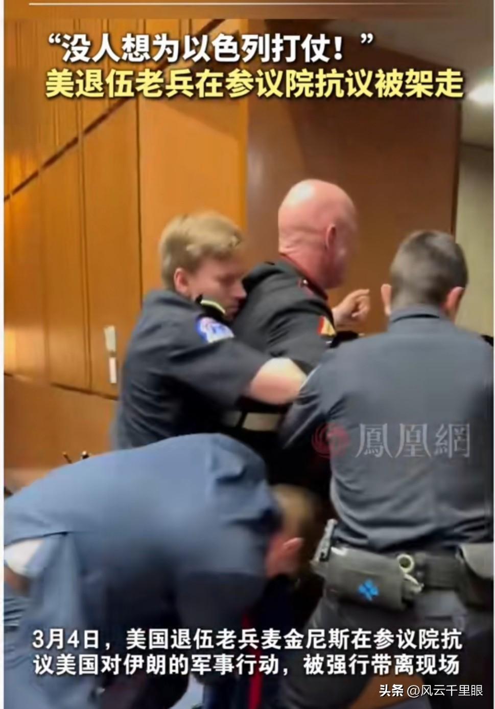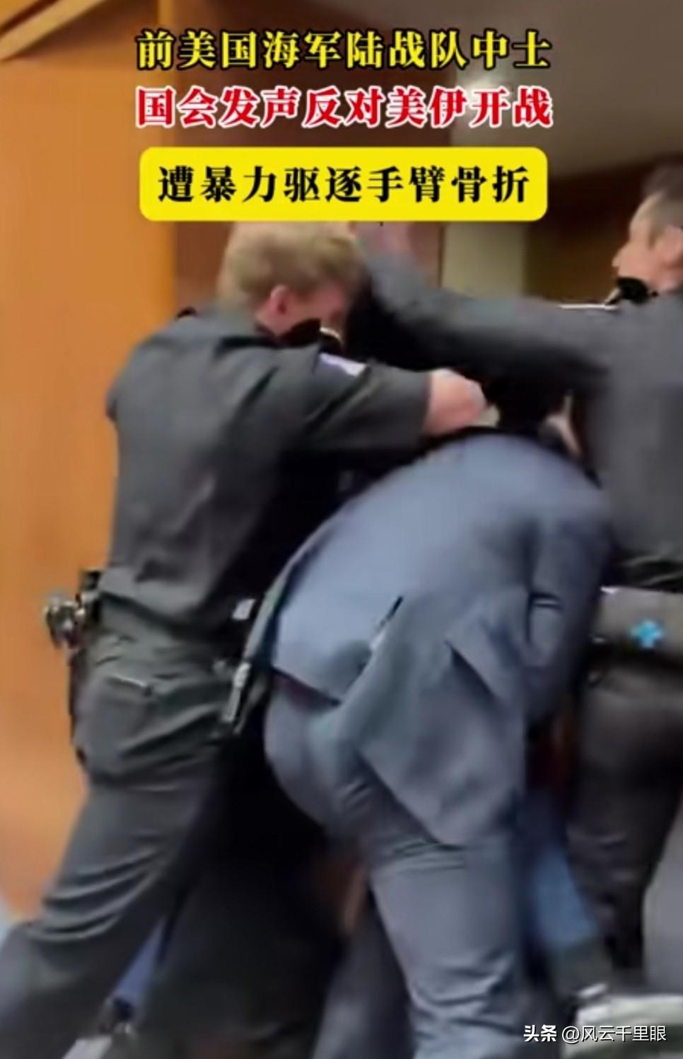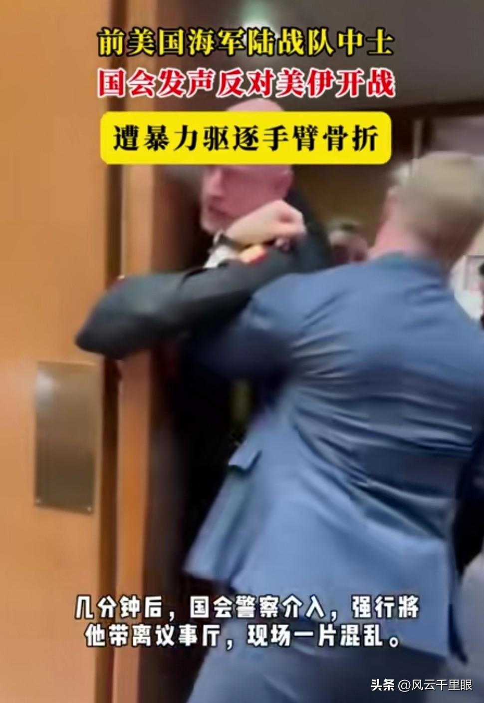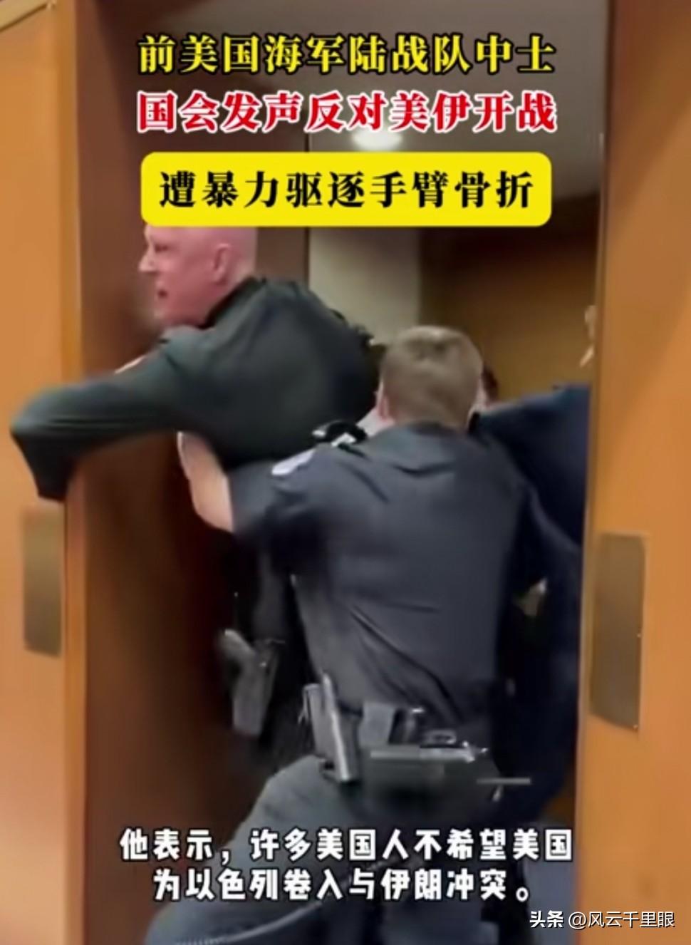 【美国爱国老兵议会抗议,胳膊被折断一声不吭】 前美国海军陆战队退伍老兵大闹参议院,因其反对帮以色列打仗而被保安拖走。 大概有四五个人拉着他,他口中一直高喊不能帮以色列打仗。 但突然来了几个强壮的保安把他按倒,老兵仍然挣扎着,期间被绊倒摔在椅子上,几个人仍不停手。 老兵被拉扯着推出去,但他仍不放弃,走到门口时使劲抓着门缝。 他的手卡在门缝中,因为保安的拉扯,一声清脆的骨头断裂的声音响起,老兵没有哼一声,只是一直强调自己的诉求。 他们明明听到了,并大喊他的手断了,却并没有人停手,他扔被众人强行带走。 这就是美国的自由,一个为国付出青春的美国老兵,就这么被暴力对待。 仅仅因为不想让美国成为以色列的工具,仅此而已。 自由美利坚吗?美退伍老兵高喊没人愿为以色列而战 美国一名军人在以色列驻美使馆外自焚 有时候帝国崩塌,只需要一场错误的战争。