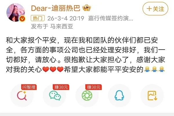 迪丽热巴终于报平安了。这次事真的能看清很多人。