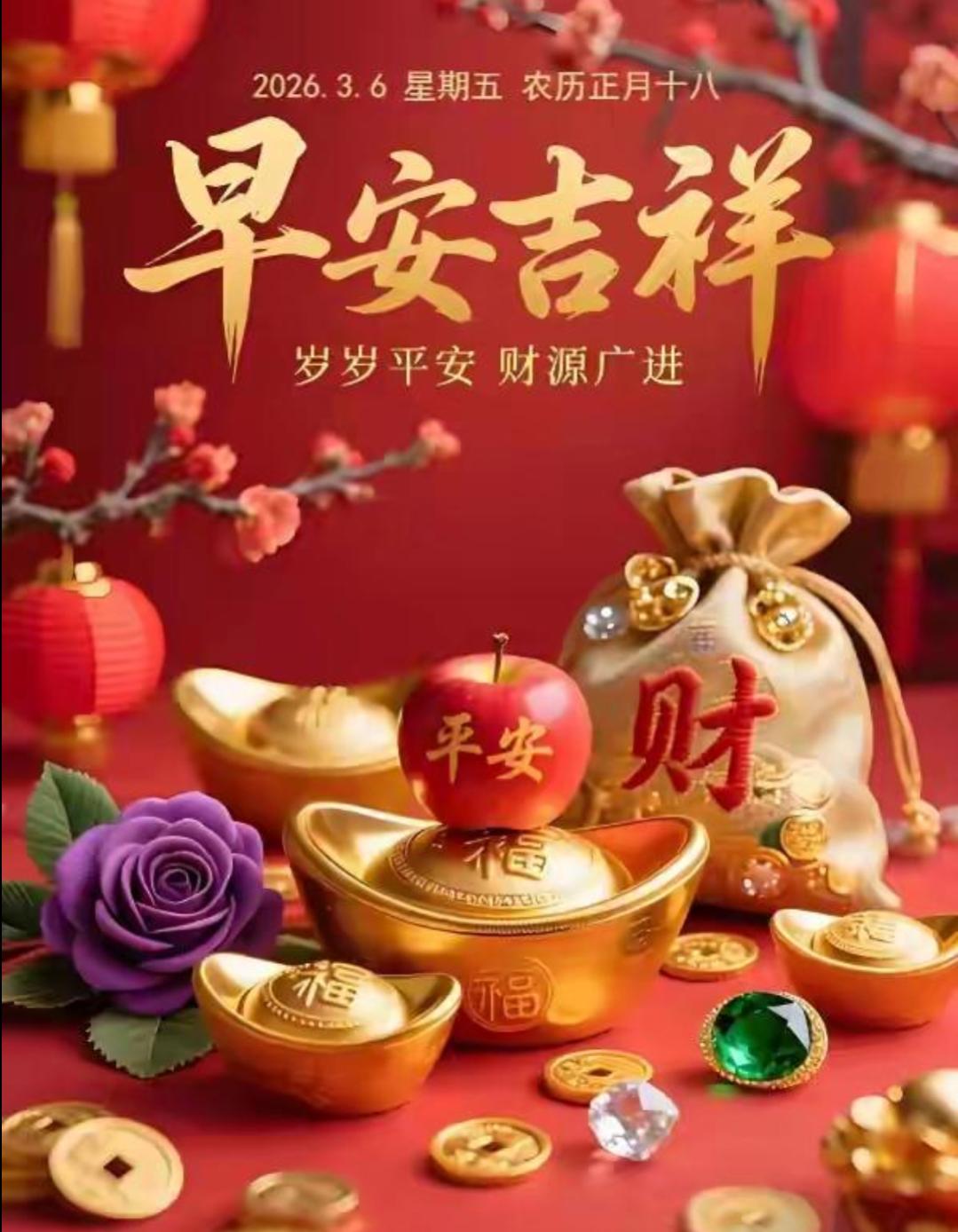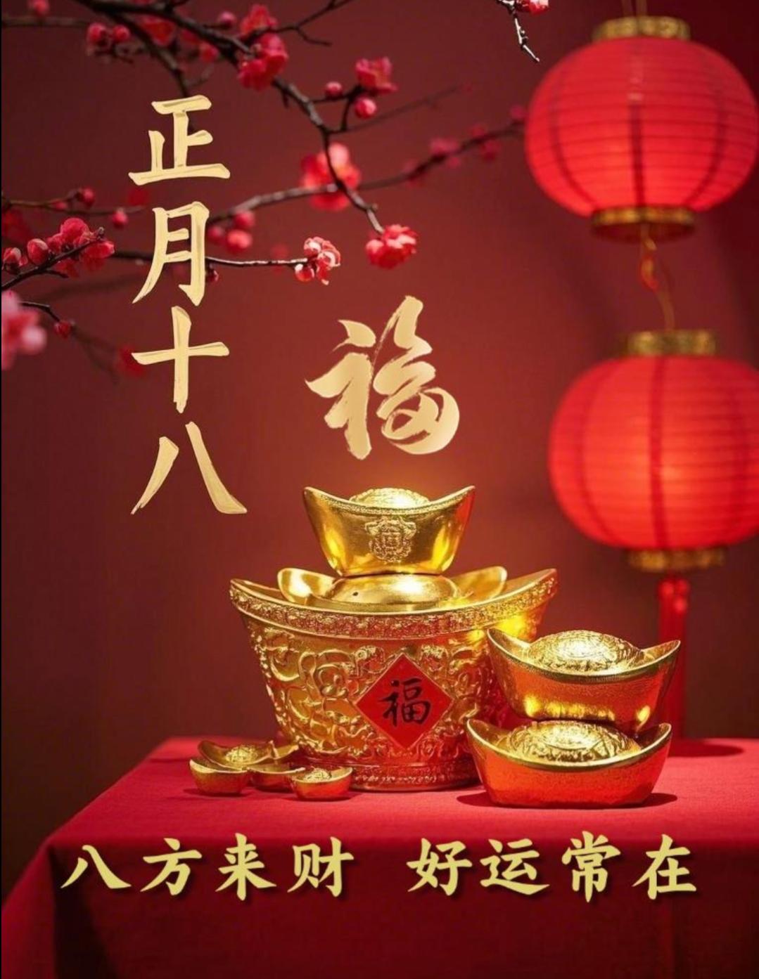 正月十八,接财纳福。在这个喜庆吉祥的日子里,愿你:好运绽放,八方来财,事事顺心,福气满满,岁岁皆如意,年年皆平安。早安!😊🎉