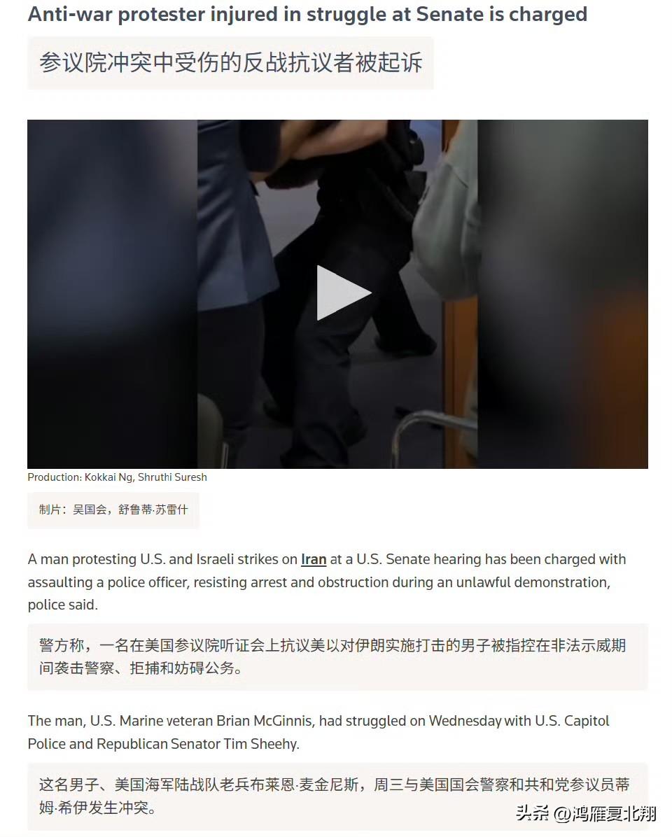 因高喊没人想为以色列而战,美国退役老兵被逮捕 此前在美国国会高喊"没人想为以色列而战,被直接折断手臂的美国陆战队老兵布莱恩·麦金尼斯,被美国警察以非法示威、非法抗议、妨碍公务等罪名逮捕,预计将马上送交司法机构进行审判 Ps:可惜了,美国这下又少了个硬汉,义人