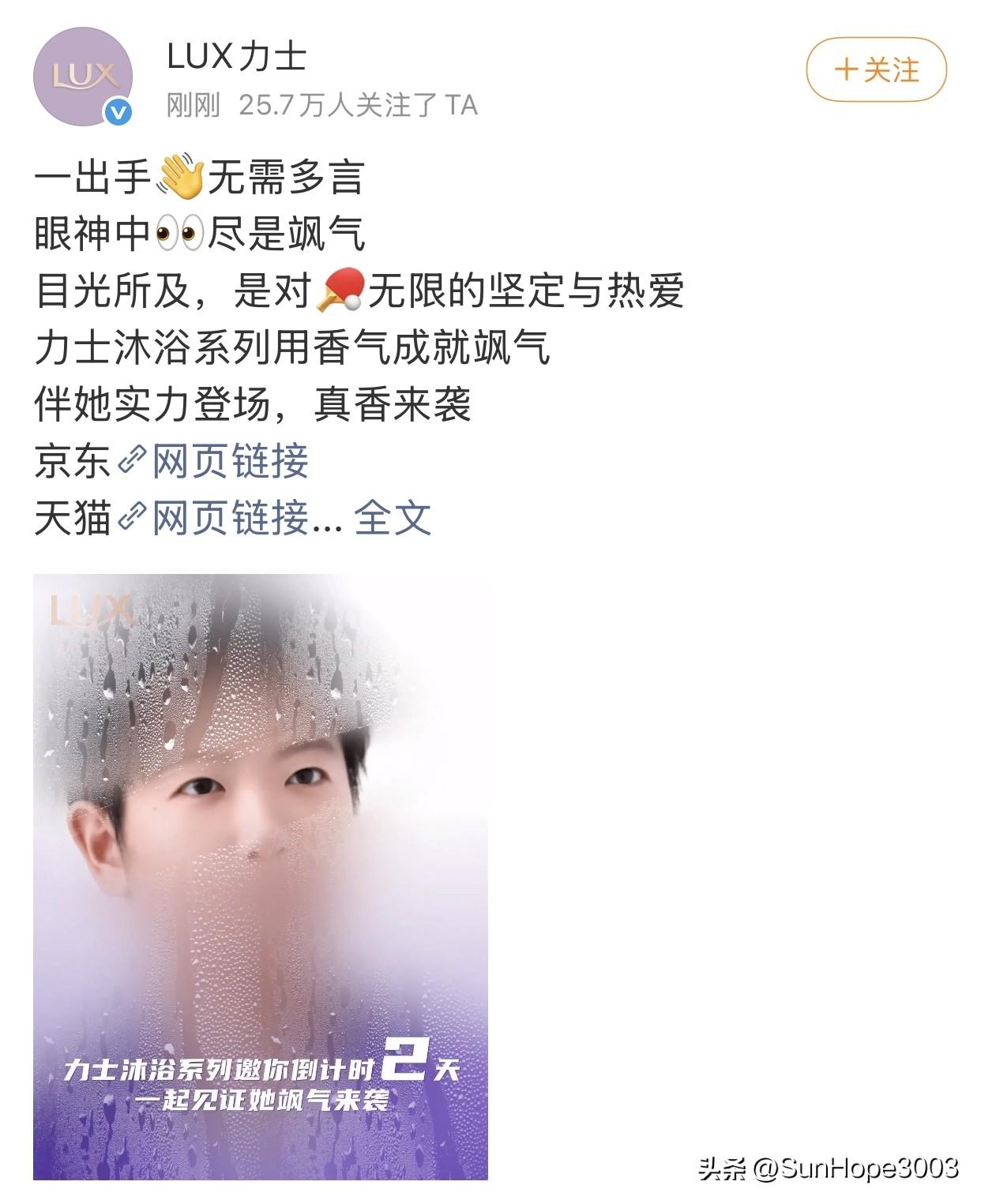 孙颖莎新代言,即将官宣喽,眼睛真的好美 力士开始预热,最新消息,发了一个莎莎几秒的动图,这双眼睛,这个🏓,一看就是孙颖莎。 紫色的小莎即将到来,目前是预热阶段, 3月8日正式官宣, 粉丝们已经开始加购。 这一年多来,可以一次次保持千万级别销量的,也就孙颖莎了, 她只管练球,打比赛,有时间了拍个视频, 其他的事情粉丝们自会搞定, 买莎莎代言的产品,基本靠抢。