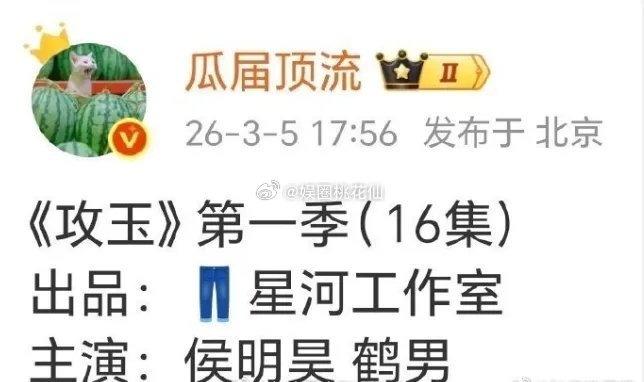 听说《攻玉》的男女主定了侯明昊和鹤男?不过侯明昊的粉丝好像不太乐意。鹤男是98年的小花,现在确实没什么拿得出手的作品和角色,之前在侯明昊的《入青云》里演女二。再说这《攻玉》的饼,也算不上多好。22年就传白鹿会演,23年又说白鹿和陈哲远;24年更离谱,传过于适和虞书欣,还传过肖战和孙珍妮,肖战那边都明确说不演了;25年轮到龚俊和田曦薇,还有赵露思和田栩宁、赵露思和杨旭文,甚至敖瑞鹏和艾米都被溜过;26年1月又说赵露思和宋威龙……这一圈溜下来,谁还信这是好饼啊?