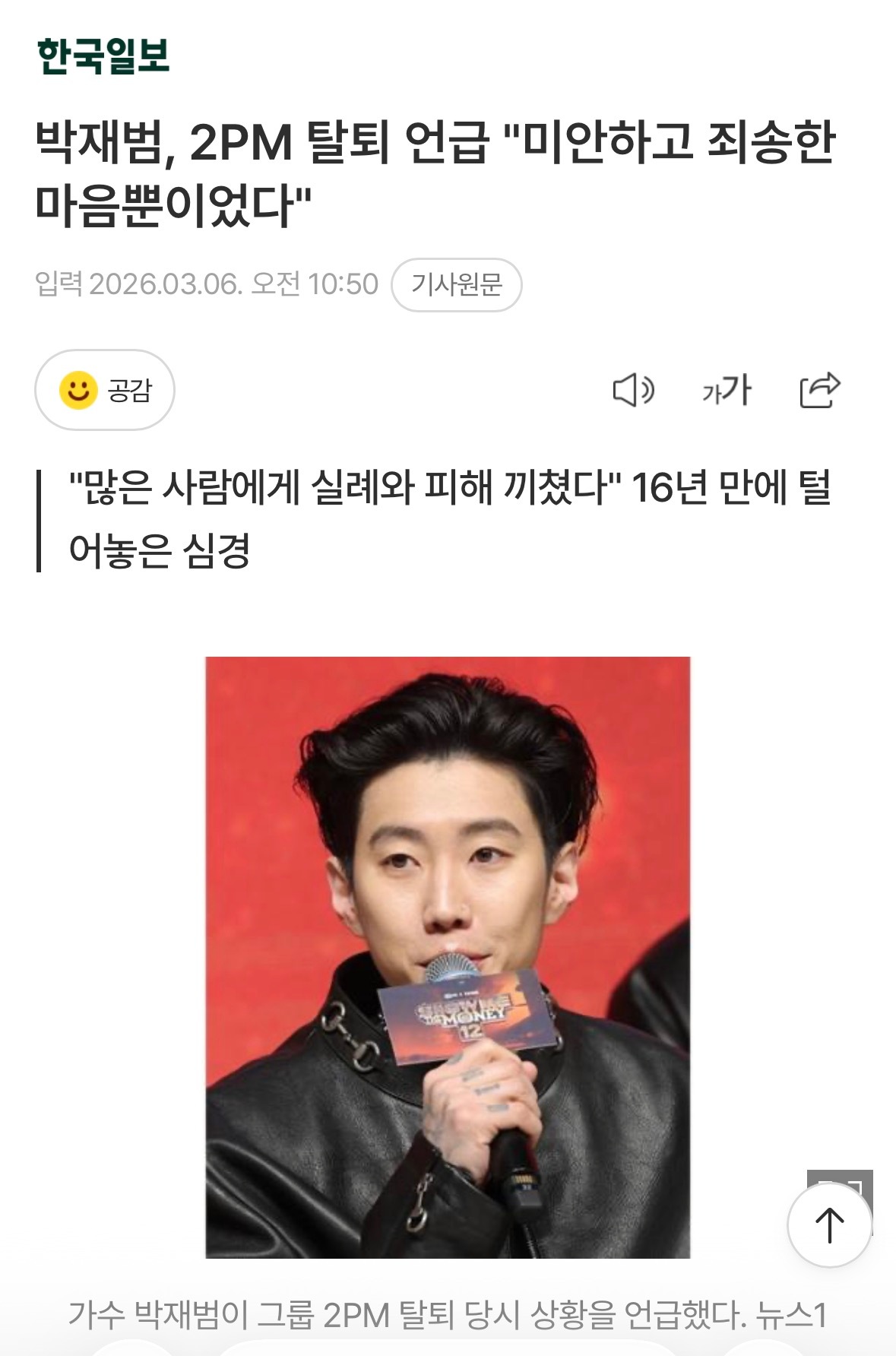 朴宰范回应退出2PM朴宰范提及退出2PM“很抱歉很对不起的心情” 5日,YouTube频道Aiz杂志上公开了题为“改变朴宰范人生的歌词心理学”的视频。该视频中朴宰范作为嘉宾出演,讲述了他从爱豆活动到solo出道,到作为娱乐代表兼制作人活跃到现在的旅程。 视频中朴宰范提到了在2PM最活跃的时期退队的情况。他坦言“只有很抱歉很对不起的心情”,“不管怎样,都对很多人非常失礼,造成了损失”。对于退团的同时停止活动,他说“完全没有不安感”,“只是接受了,在当时的情况下尽了最大的努力”。 退出2PM后回到美国的朴宰范通过在YouTube频道上传的翻唱视频恢复了活动。他说“当时东方裔美国人上传翻唱视频很流行”,“我也想展示我的音乐品味,所以用收到礼物的笔记本电脑拍了视频上传,一天之内获得了300万次浏览量。之后接到了很多地方抛来的橄榄枝,重新开始了活动”。 接着,朴宰范传达了自己的价值观。他说“我是不怕被骂的类型,我不遵循'歌手应该这样,艺人应该那样'的框架。某人定下来的先入为主的观念、标准、规则、别人的意见对我来说并不重要”表示了自己的信念。