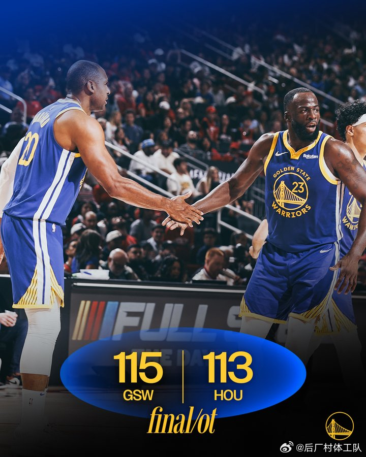 加时险胜,勇士115-113战胜火箭,加时赛波杰姆斯基发挥出色连得5分扩大比分,然而梅尔顿一次失误和三分犯规让火箭迫近比分,但杜兰特错失关键罚球没能追平比分,最后时刻勇士领先1分,梅尔顿上篮不中但自己完成补篮准绝杀火箭。