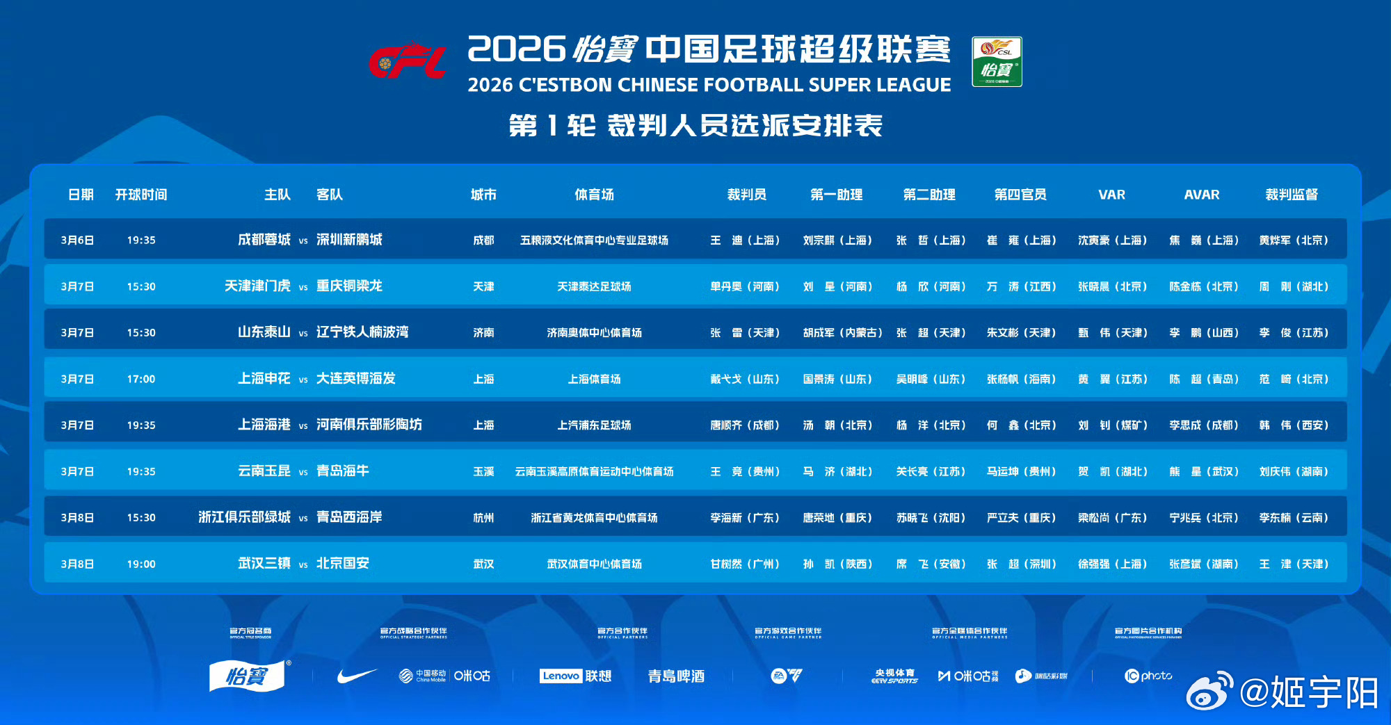 首轮中超裁判名单公布,揭幕战主裁判王迪。申花对大连英博主裁判戴弋戈。海港对河南主裁判唐顺齐。