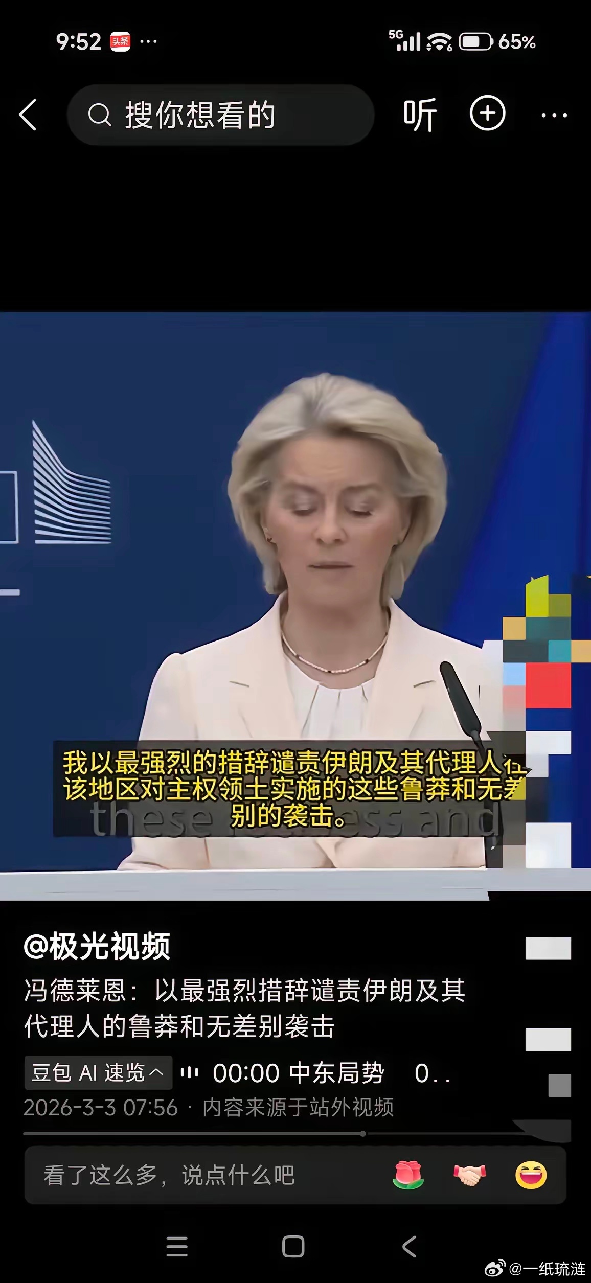 一句话暴露了冯德莱恩的虚伪。毫无疑问,冯德莱恩是在昧着良心讲这一段话。“我以最强烈的措辞谴责伊朗及其代理人在该地区对主权领土实施的这些鲁莽和无差别差别的袭击”的这段话一出口,她的灵魂在拷问她,因此明显的她整个人无精打采。不谴责侵略者毫无人性地轰炸一个主权的学校、医院、总统府,反而昧着良心迎合霸权主义,指责被强权欺压的受害方,这无疑是对侵略者的鼓励,对国际法的无视,对人类良知的践踏。这是欧洲的耻辱,更是欧洲的悲哀。