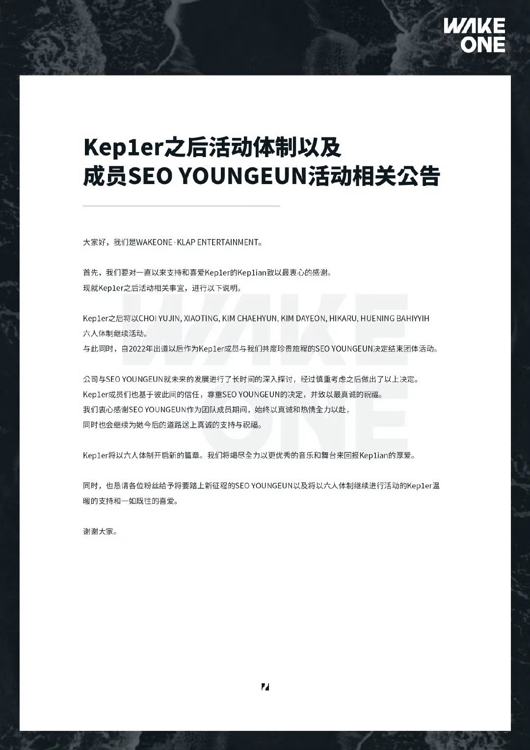 徐永恩退团Kep1er徐永恩在讨论后决定结束Kep1er的团体活动,Kep1er将继续以六人体制进行活动