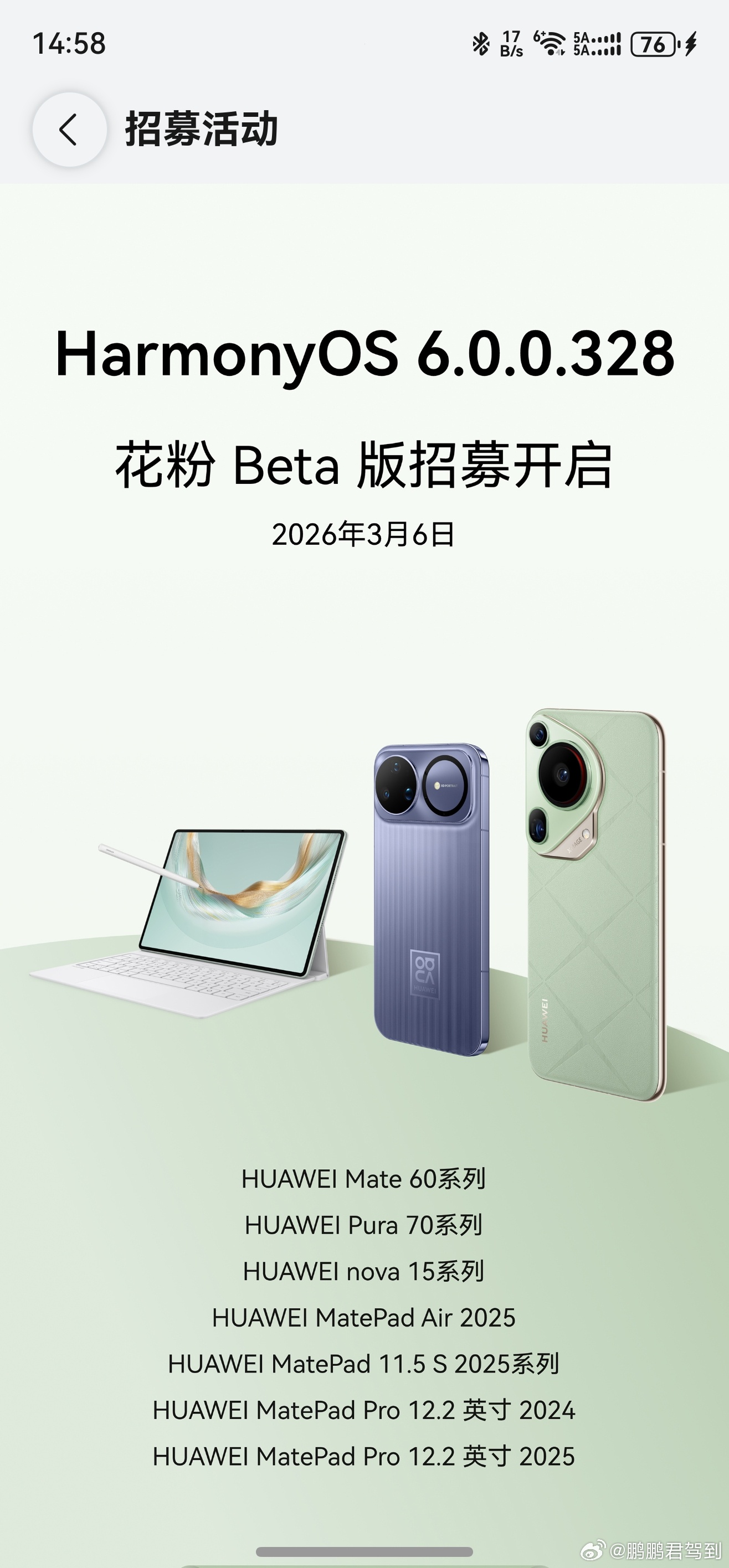 nova 15系列、Mate 60系列、Pura 70系列的 HarmonyOS 6.0.0.328花粉 Beta 版招募开启了!小伙伴可以在设置>搜索"软件更新(右上角::)">升级尝鲜,进行花粉 Beta 版报名。鸿蒙越用越香 我的鸿蒙体验 华为