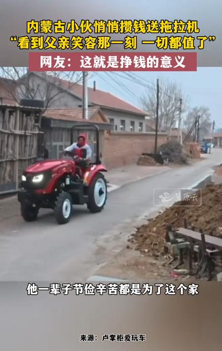 送到心坎上了!内蒙古小伙悄悄攒钱送拖拉机,父亲笑成孩子,这才是挣钱的意义 3月初的内蒙古赤峰,还带着几分未散的寒意,村口的空地上,一台崭新的拖拉机静静停着,金属车身在阳光下泛着亮闪闪的光。 一位满脸皱纹的老人,围着拖拉机转了一圈又一圈,粗糙的手小心翼翼地摸了摸车斗,又轻轻碰了碰方向盘,嘴角的笑意藏都藏不住,眼睛里更是亮得像盛了星光,连眼角的皱纹都舒展开来。 没人知道,这台让老人笑开颜的拖拉机,是他的儿子攒了整整一年的心血。小伙今年二十多岁,从小在草原边上长大,看着父亲一辈子和土地打交道, 家里那台老拖拉机已经用了十几年,机身早已斑驳不堪,发动机时不时就出故障,每次耕地、拉粮,父亲都要花比别人多几倍的力气,却从来舍不得换一台新的。 小伙毕业后没选择留在城市,而是回了家乡附近的县城打拼,找了一份辛苦但踏实的工作。从上班的第一天起,他就悄悄定下了一个目标——给父亲换一台新拖拉机。 为了这个目标,他彻底戒掉了年轻人的浮躁,不再和朋友出去聚餐、娱乐,每天除了上班,一有空就去做兼职,哪怕是熬夜加班,也从来没有抱怨过。 这一年里,他省吃俭用,把每一笔省下来的钱都小心翼翼地存进银行卡,看着卡里的数字一点点增加,他心里就多一份期待。 他偶尔会趁着休息时间,悄悄去看拖拉机,对比款式、打听性能,反复挑选最适合家里耕地、拉粮的型号,生怕买错了让父亲不满意。 直到3月初,他终于攒够了钱,悄悄联系好卖家,趁着父亲去地里干活的间隙,让卖家把拖拉机送到了村口。他没有立刻告诉父亲,而是在村口等着,想给父亲一个大大的惊喜。 当父亲扛着农具从地里回来,看到村口那台崭新的拖拉机时,整个人都愣住了,站在原地看了好久,才不确定地看向儿子。 看着父亲疑惑又惊喜的眼神,小伙才笑着点头,告诉父亲这是给他买的新拖拉机。那一刻,父亲再也抑制不住心里的喜悦, 脸上的笑容越来越灿烂,一边围着拖拉机打转,一边不停地抚摸着车身,连话都有些说不连贯。那是一种发自内心的、不加掩饰的开心,是辛苦一辈子,被儿子记挂在心上的满足。 小伙站在一旁,看着父亲笑成孩子的模样,所有的辛苦和疲惫都烟消云散。这一年来的省吃俭用、熬夜加班,所有的付出在这一刻都有了意义。他不需要父亲说一句感谢,只要能看到父亲这样的笑容,就觉得一切都值了。 后来,这件事被身边的人传到了网上,很快就引起了网友们的热议。有人说,这才是真正的孝顺,不是嘴上说说,而是用实际行动回报父母的付出; 也有人感慨,原来挣钱的意义,从来都不是为了自己享受,而是为了能让身边最亲的人过得好一点,能在他们需要的时候,有能力给他们一份惊喜和依靠。 没有华丽的语言,没有惊天动地的举动,这个内蒙古小伙用自己的方式,诠释了孝顺的意义,也告诉了所有人,努力挣钱的真正价值。 父母一辈子为我们操劳,默默付出,而我们能做的,就是在自己有能力的时候,多一份惦记,多一份行动,用小小的惊喜,温暖他们的晚年。 对此,你们有什么看法,欢迎评论留言~