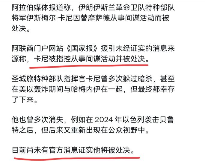 骇人听闻!伊朗内部居然隐藏着这么高级别的奸细! 3月6日,外媒报道称,伊斯兰革命卫队特种部队将军伊斯梅尔·卡尼因代表摩萨德从事间谍活动而被处决。伊斯梅尔·卡尼是特种部队的负责人,在多次暗杀企图中幸存下来,甚至在美以轰炸期间与哈梅内伊在一起但都幸存了下来。 可能有人觉得,一个将军而已,背叛能有多大影响?那可就太天真了。卡尼作为伊斯兰革命卫队特种部队负责人,同时还是圣城旅的指挥官,手里掌握着伊朗全部的海外特工名单、秘密资金通道、导弹基地部署,还有核设施的相关机密,他的背叛,相当于把伊朗的国防和情报体系彻底暴露给了美以。 就拿最近几年来说,伊朗的核科学家被遥控机枪击毙、军事基地多次被精准空袭、指挥链频繁出现漏洞,之前大家都以为是美以的技术太先进,现在才明白,根本就是有内鬼在背后递地图、送情报,而卡尼就是那个最大的“叛徒头目”。 最近,伊朗正在全力清理内部的间谍网络,除了卡尼被处决,3月4号当天,伊朗安全部门还在北部厄尔布尔士省和首都德黑兰附近,又逮捕了2名摩萨德特工,从他们身上搜出了通讯设备、武器和大量弹药,这也能看出来,摩萨德在伊朗内部的渗透有多深,不仅仅是卡尼这一个高级奸细,还有不少隐藏在各个部门的小喽啰,专门负责传递情报。 说句调侃的话,伊朗这是相当于在自己家里养了一群“白眼狼”,平时吃着国家的、拿着国家的,关键时刻就捅国家一刀,也难怪伊朗会这么强硬地处决卡尼,就是要杀一儆百,震慑那些隐藏在暗处的内鬼。 其实卡尼的下场也是咎由自取,身为国家的高级将领,本该守护自己的国家和人民,却被利益诱惑,背叛了自己的信仰和使命,到最后落得个被处决的下场,一点都不冤。 而且他的事情也给伊朗提了个醒,越是核心岗位,越要严把用人关,不然一旦出现内鬼,造成的损失就是无法挽回的。 现在伊朗虽然处决了卡尼,但清理间谍网络的路还很长,毕竟摩萨德经营这么多年,不可能一下子就被彻底清除,后续还会有更多的内鬼被揪出来,只是希望伊朗能吸取教训,不要再出现这么高级别的背叛事件了。