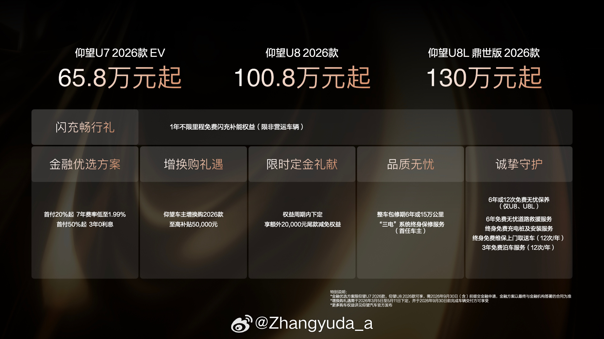 此外,仰望汽车还推出了闪充畅行礼遇,5月11日(含)前支付2026款仰望车型定金的用户,自交付之日起,可享受一年内在比亚迪闪充充电桩免费充电权益(限非营运车主)。2026年年底前也将建成2000座闪充高速站。闪充技术赋能极致体验