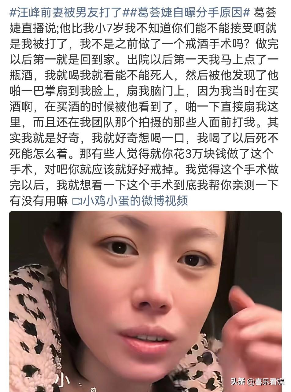 汪峰前任葛荟婕,自曝被小7岁男友打! 3月6日,汪峰的前任葛荟婕,自曝被小7岁男友打的一段视频冲上了热搜,没想到,不少网友看完后,却一致的表示:“确实该打”。 画面中,葛荟婕是素颜出镜,黑眼圈明显,嘴唇也有些裂开了,整个人看起来不再往日的精气神。 葛荟婕称:此前自己做了戒酒手术,术后出院回家的当天,她做的第一件事情,就是订酒,然后马上喝。 而葛荟婕称这么做的原因,就是为了看看这手术的效果,是不是会有所影响。 当天她喝酒的时候,就被男友发现了,男友当场就给了她“一巴掌”,还拍打她的脑门。 看到葛荟婕讲述她被小7岁男友打的这过程,很多的网友都没有同情她,反而觉得她“该打”。 大家觉得男方应该是着急了,而是葛荟婕本身做的手术就是为了戒酒,没想到术后第一件事就去喝酒,虽说男方的方式用错了,但出发点没有毛病。 对此,你们怎么看?