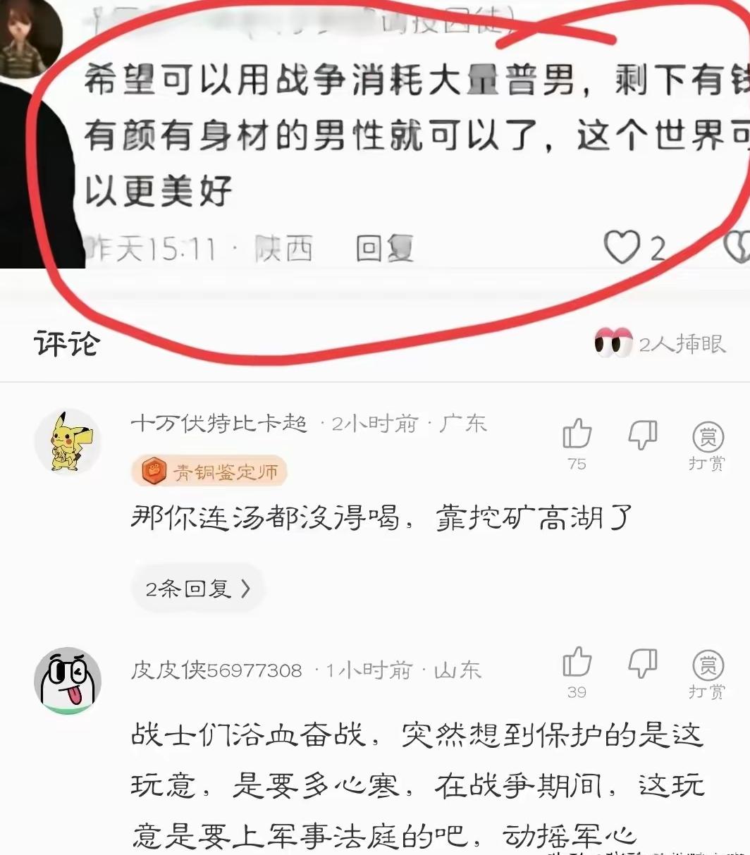 发出这样的信息应该丢到中东去!很多女的太自信了,总觉得自己是公主,被家里宠上天就想要所有的男人捧在手里!京东上次请来的那个女权主义,就是她发明的普信男吧,这个世界就是普通男人托住的! 战争不是开玩笑,伊朗和以色列的情况可以去看看!水都喝不上,生命都没法保障,谁人会在乎你的矫情!