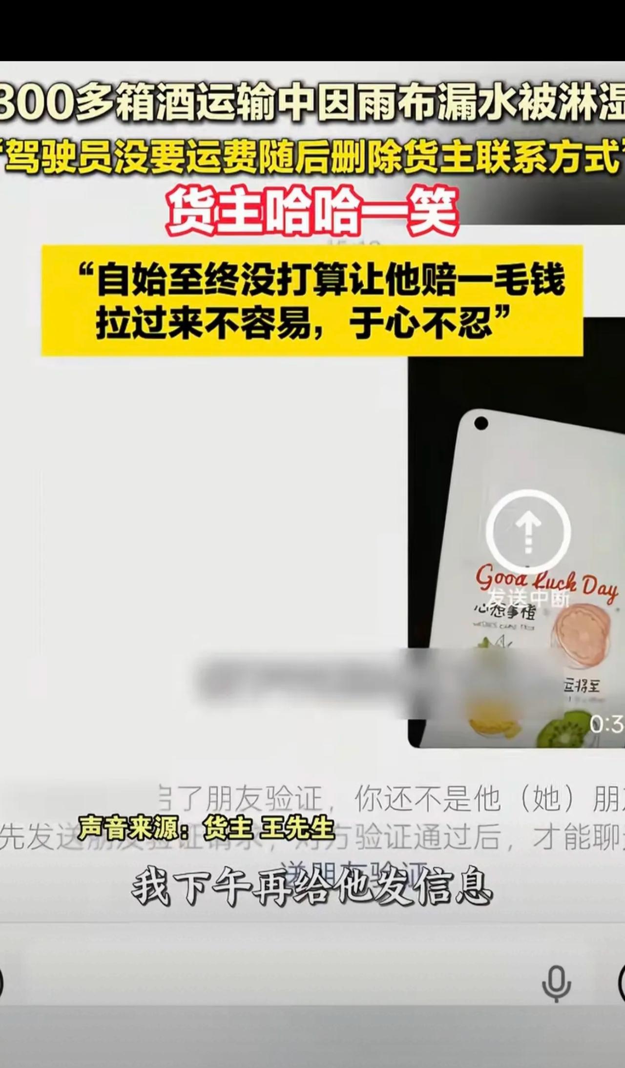 “老板大气!”安徽,男子找一货车司机运送345箱酒,送到后,他掀开雨布发现最少有300箱酒被淋湿,司机说:340元运费我不要了,你看咋弄吧。然后,开车走了。等男子给司机发信息协商时,不料,对方竟然把拉黑,微信也删除了。男子无奈,哈哈一笑说:我从来没打算让他赔一毛钱。之后,说了一番话令人感动。网友:司机格局小了。 安徽的王先生,委托货车司机运送345箱酒水。 本是一趟普通的货运,谁料途中突降大雨,司机的雨布破损漏水,等货物送达,王先生掀开雨布的瞬间,心都凉了半截。 整整300箱酒,外包装全被雨水泡得变形发软,水渍斑驳,彻底失去了售卖品相,损失惨重。 本以为司机会主动协商解决,可他的操作,让人大跌眼镜! 当场慌了神,只丢下一句:340块运费我不要了,你看着办吧,说完立马开车走人。 更离谱的是,等王先生想主动联系沟通时,发现自己早已被司机微信删除、电话拉黑! 说实话,换做任何一个人,遇到这种事都会怒火中烧。 货损数万,对方不仅不负责,还直接玩消失,换谁都忍不了! 可接下来王先生的一番话,直接让全网网友竖起大拇指! 他无奈地笑了笑,坦言:我从一开始,就没打算让他赔一分钱! 在他眼里,货车司机常年跑长途,大半夜赶路、烧油受累,挣的都是拿命换的辛苦钱。 就340块的运费,怎么忍心让他承担几万块的赔偿?实在于心不忍。 至于这些被泡坏的酒,王先生也早已想好办法:拆箱散卖,低价处理,所有损失,自己全部承担! 此事一经曝光,评论区直接炸锅了! ✅ 网友怒批司机:太没担当了!货物保管不当本就是你的责任,不想赔偿可以商量,拉黑跑路算什么本事?彻底丢了信誉! ✅ 网友力挺老板:这才是真正的生意人!大气、厚道、有格局!得理饶人,比赚多少钱都让人佩服! ✅ 网友理性发声:其实能理解司机害怕赔偿,但逃避解决不了任何问题。但凡好好说句话,老板根本不会为难他! 我真的忍不住感慨几句: 从法律层面来讲,《民法典》第832条明确规定,承运人对运输中的货物毁损承担赔偿责任。 普通降雨不属于不可抗力,雨布防护不到位,司机本就该担责。 王先生占尽了道理,却选择了宽容。 他不算金钱账,只算人心账,体谅底层打工人的不易,宁愿自己吃亏,也不刁难任何人。 货车司机以为躲过了一劫,却丢掉了最珍贵的人品和长期合作的机会; 而王先生的善良与格局,才是行走世间最硬的底牌。 这年头,赚钱都难,互相体谅才是人间正道。 遇事不逃避,做人存善心,你的格局,终将决定你能走多远!