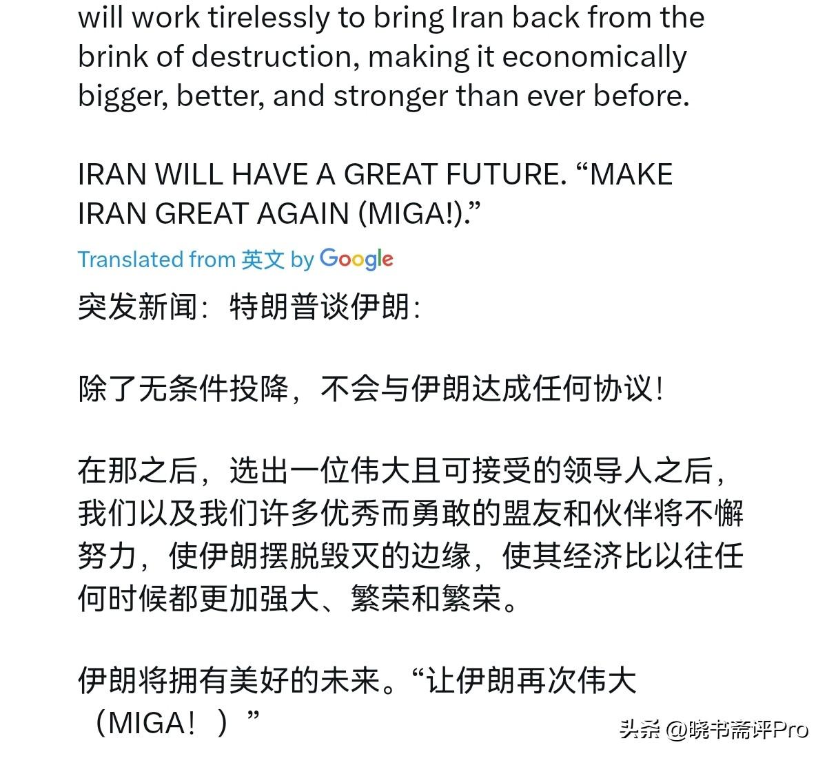 特朗普再次对伊朗放话!3月6日,特朗普声称,除非无条件投降,否则不会与伊朗达成任何协议!在那之后,在选出一位伟大的、可接受的领导人之后,我们和以及我们许多非常勇敢的盟友和伙伴,将不懈努力,把伊朗从毁灭的边缘拉回来,使其经济比以往任何时候都更大、更好、更强。伊朗将有一个美好的未来。“让伊朗再次伟大起来!” 特朗普一方面喊出要伊朗“无条件投降”,一方面又声称要“让伊朗再次伟大”,很显然,在特朗普眼中,伊朗的命运似乎只能交给美国主宰,而美国似乎自认为是伊朗命运的“拯救者”。但问题是,美国以拯救者自居,美国为何要轰炸掉伊朗的学校,摧毁伊朗的基础设施呢?这是一个拯救者做的事情吗? 很显然,美国绝对不是拯救者,而是霸凌者,美国希望把伊朗变成自己的殖民地,妄图把伊朗打烂、打服、打跪之后,再按照美国的意愿重新改造,这才是特朗普口中“让伊朗再次伟大”的真相。但伊朗的未来应该由伊朗人民主宰,而绝对不是由美国人来主宰。一个伟大的伊朗,不可能来自于美国的恩赐,伊朗当然也不会接受任由美国摆布的命运。