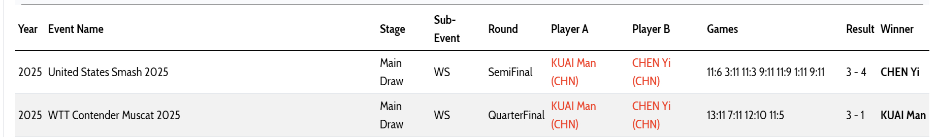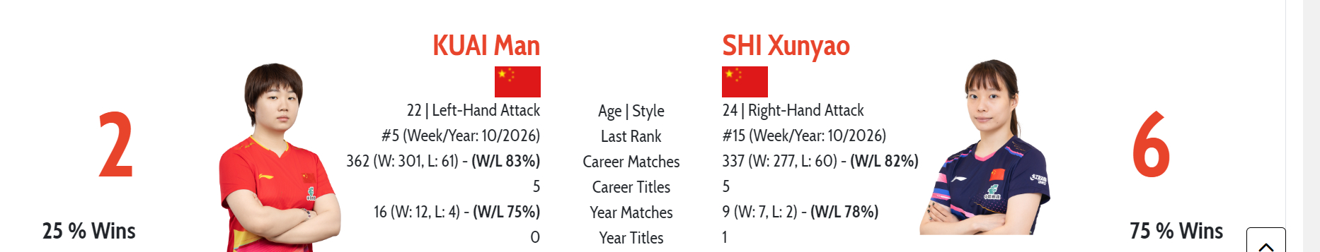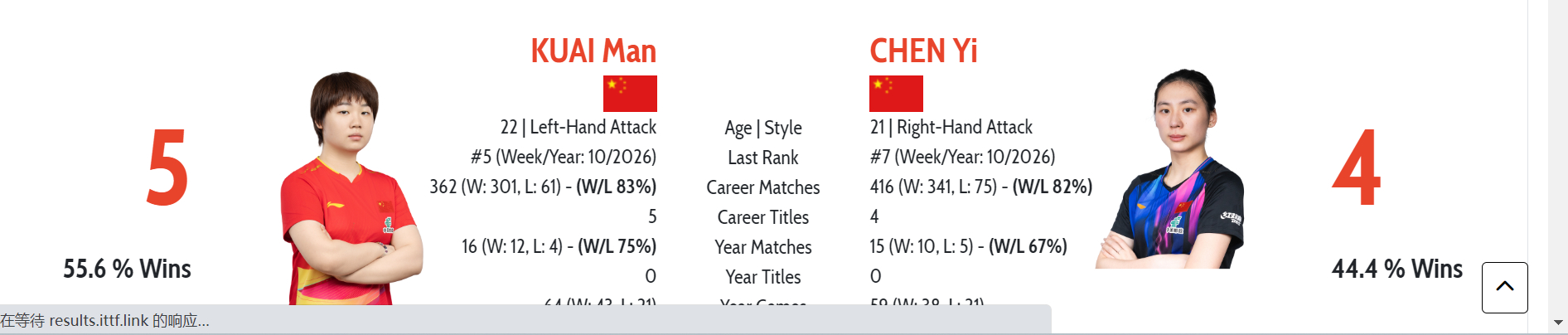 应球迷朋友的要求放一下蒯曼陈熠的头对头(图一是总头对头,图二是成人赛)蒯曼石洵瑶的头对头陈熠石洵瑶的头对头