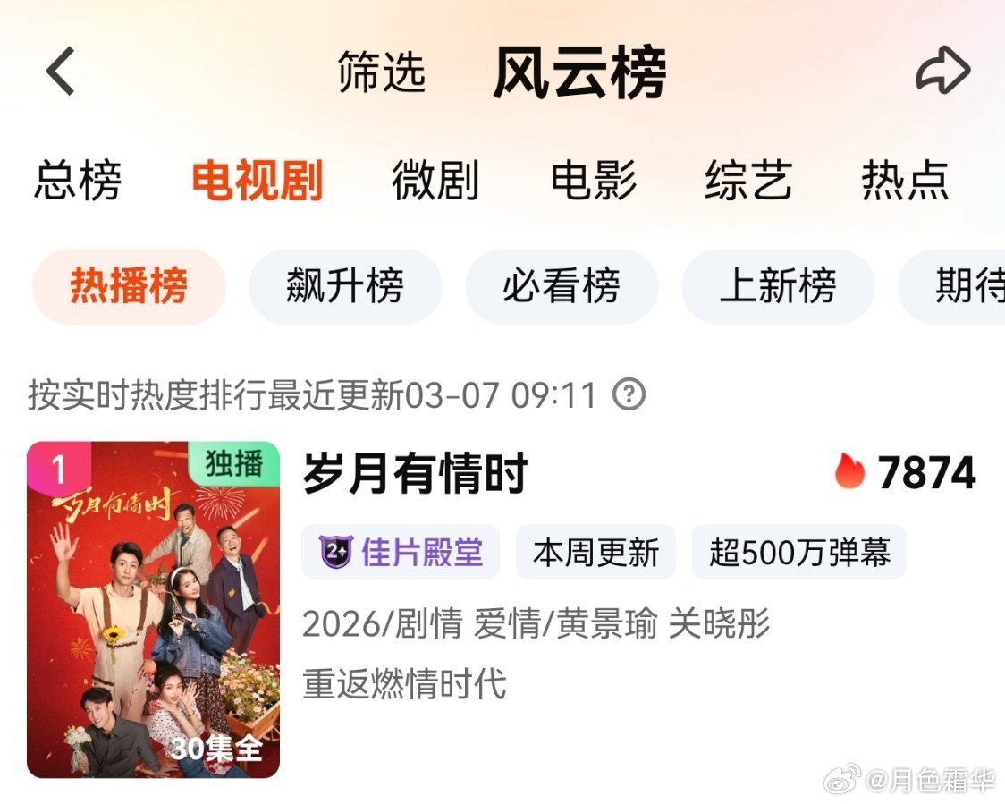 3月6日,黄景瑜岁月有情时 开播第15天,云合第3,霸屏榜黄景瑜张小满 第3,酷