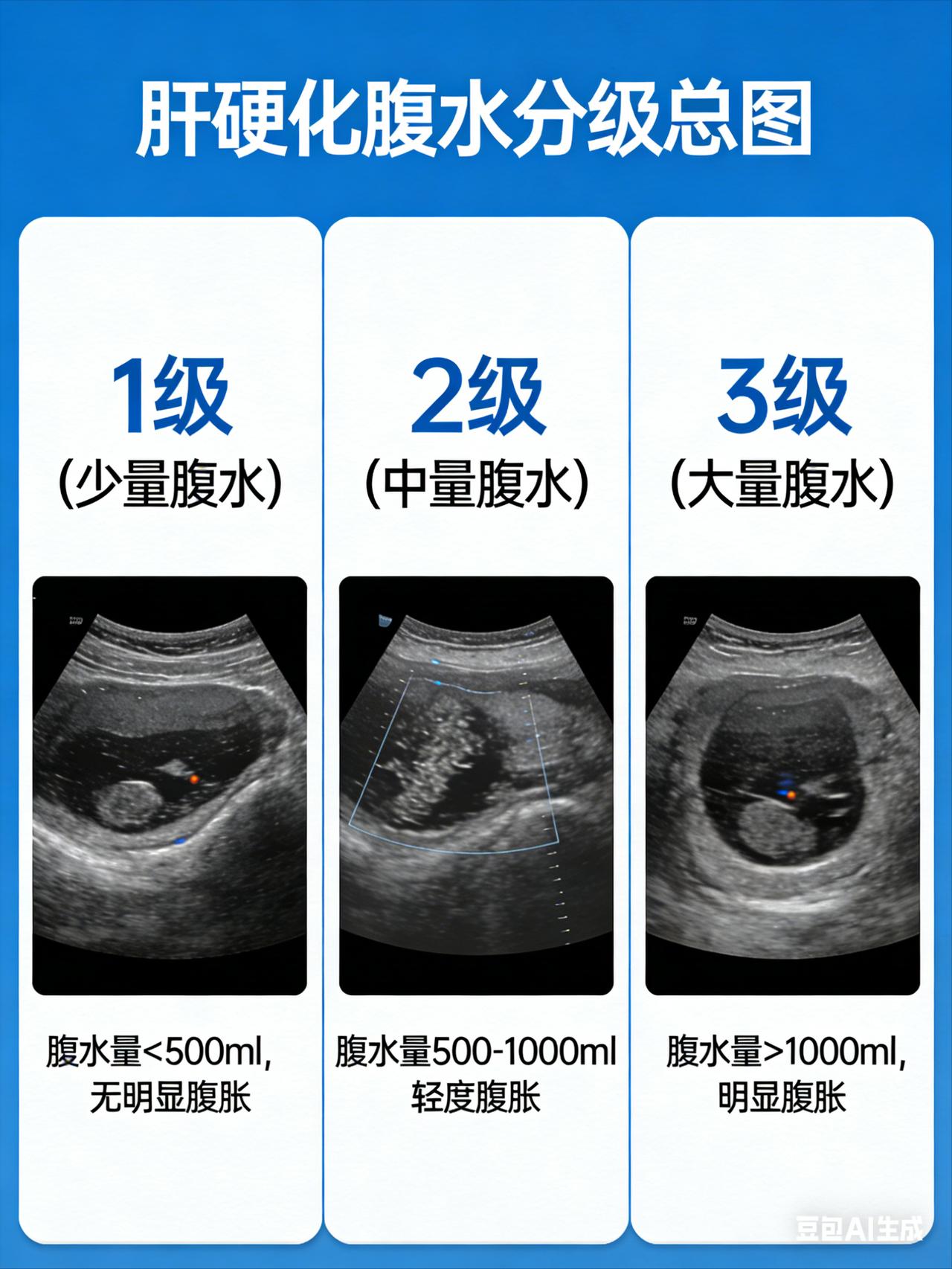 肝硬化腹水分几级,出现哪些症状需要治疗! 一级腹水(少量): 只有通过超声检查才能发现的腹水,患者一般无腹胀的表现,查体移动性浊音,阴性:超声下腹水位于各个间隙,深度10cm。必须住院治疗。 肝硬化肝硬化腹水肝病科普不懂就问有问必答