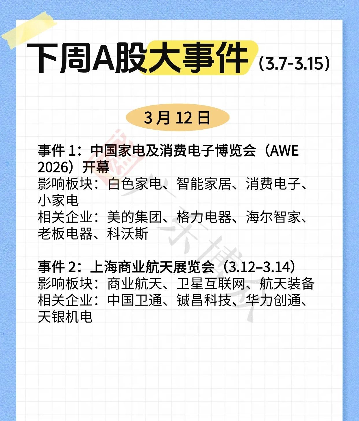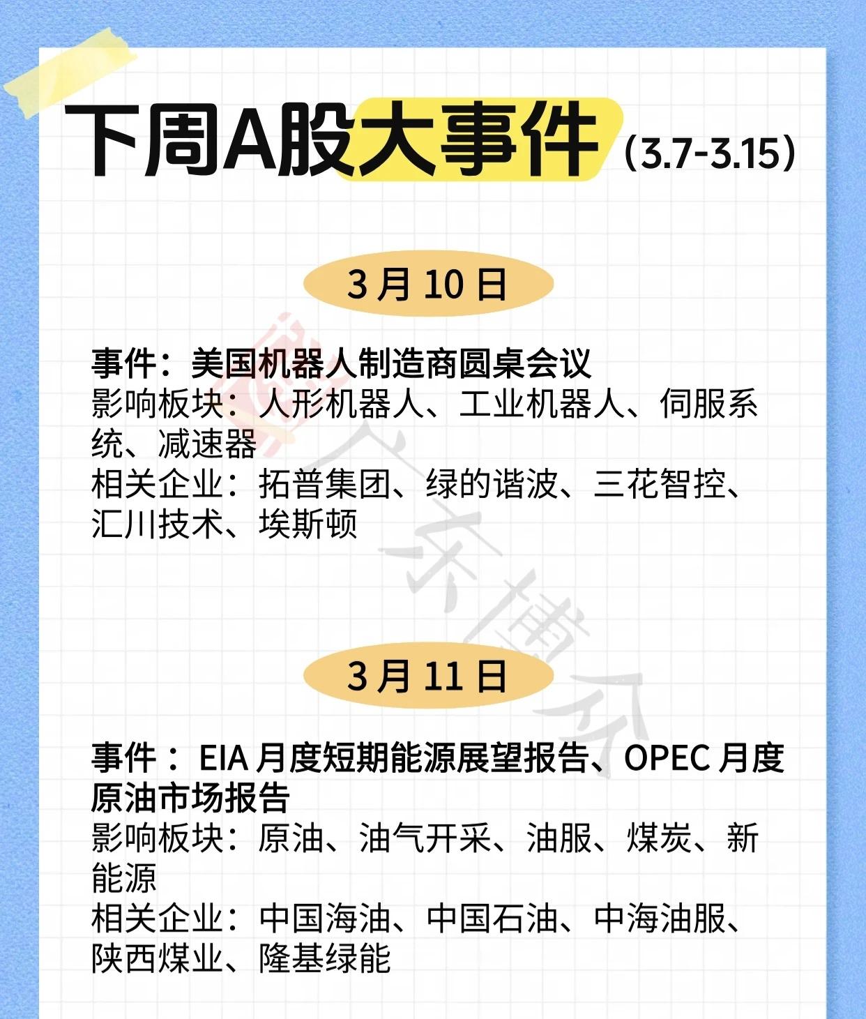 3月7日老M2月非农就业数据发布,影响全球流动性等板块及美联储降息预期;9日中国2月CPI、PPI数据发布,影响消费等相关板块;10日美国机器人制造商圆桌会议,影响人形机器人等板块及相关企业;11日EIA和OPEC能源报告发布,影响原油等板块及相关企业;12日中国家电及消费电子博览会开幕、上海商业航天展览会开展,分别影响家电消费电子、商业航天等板块及相关企业。