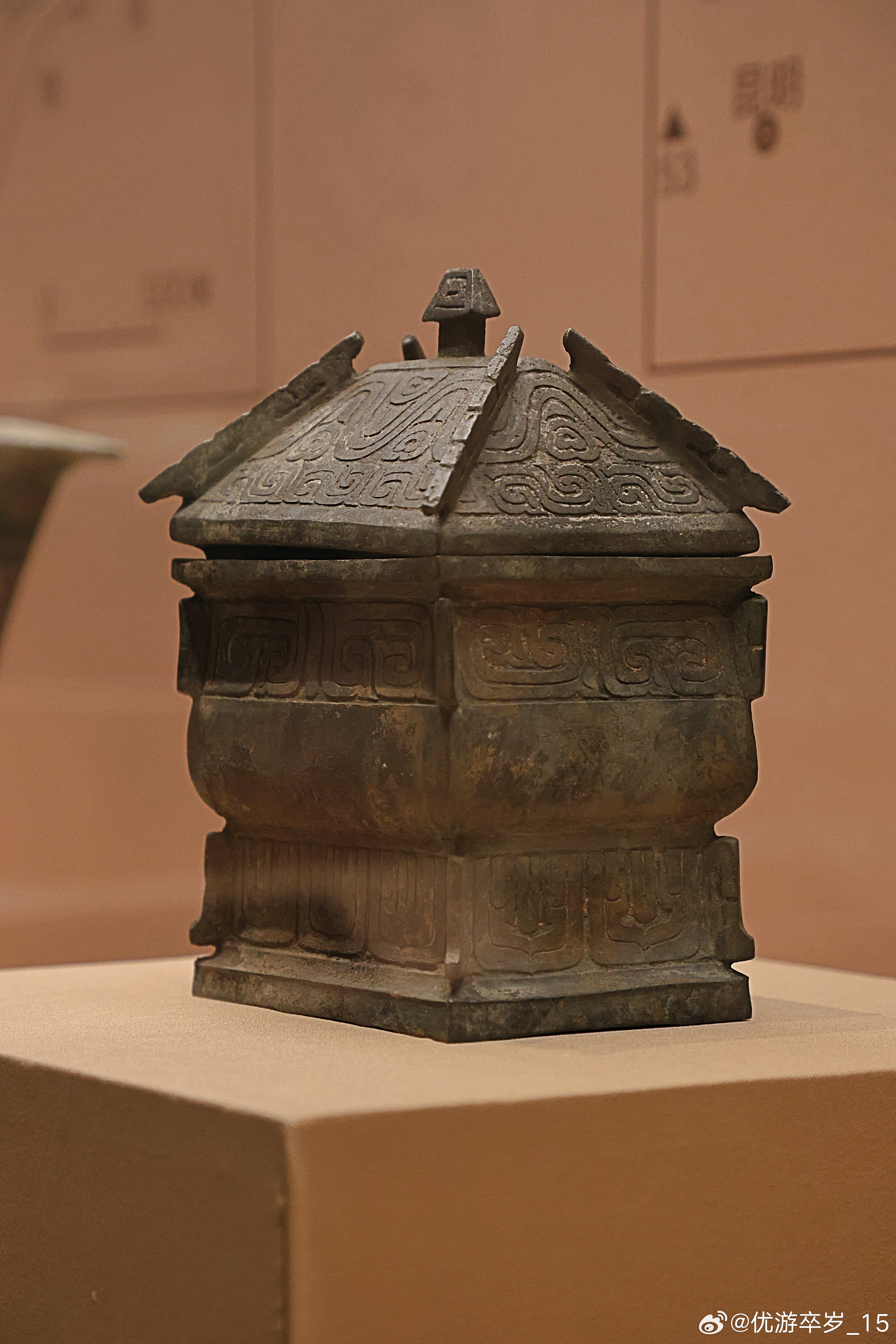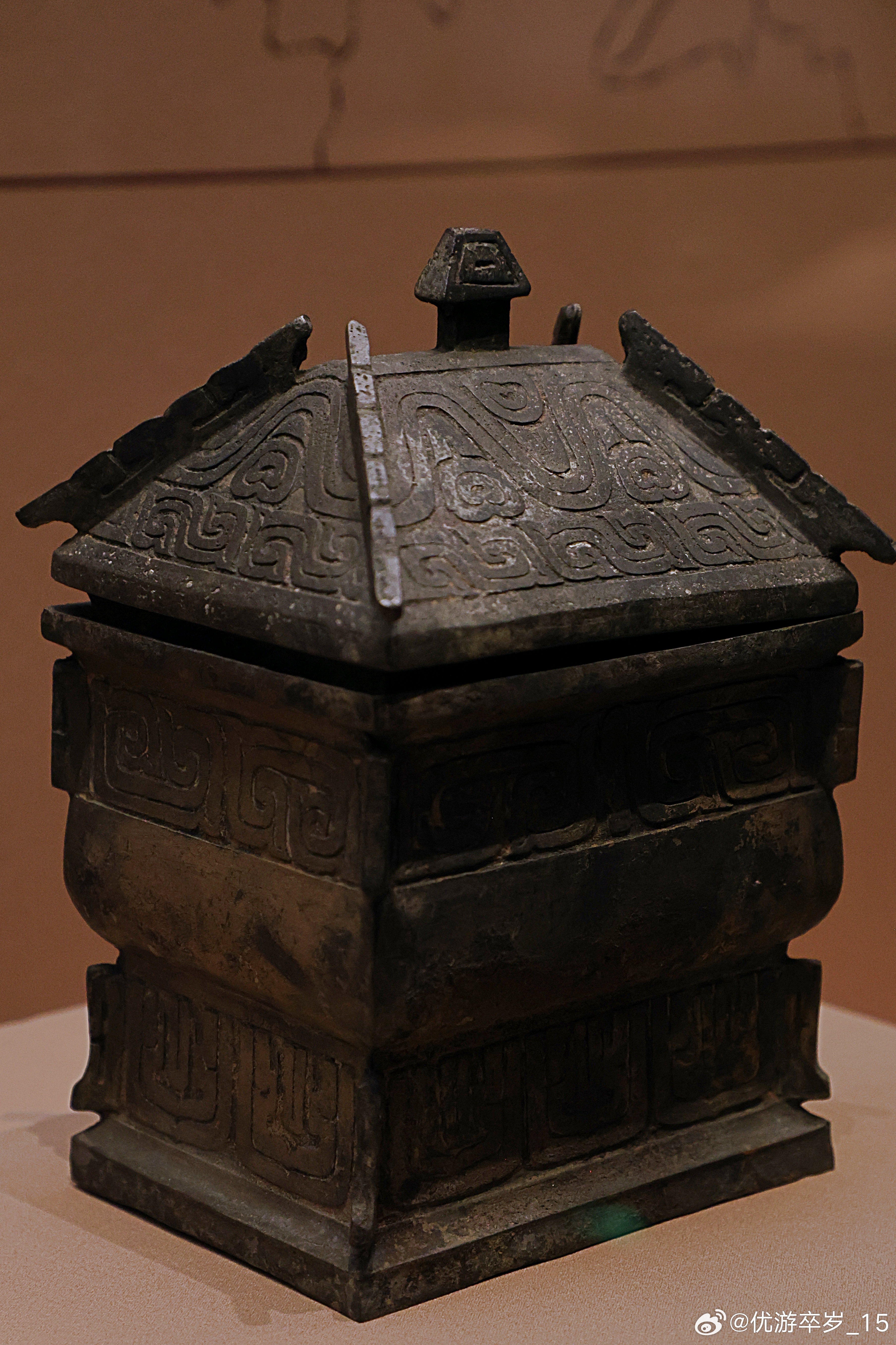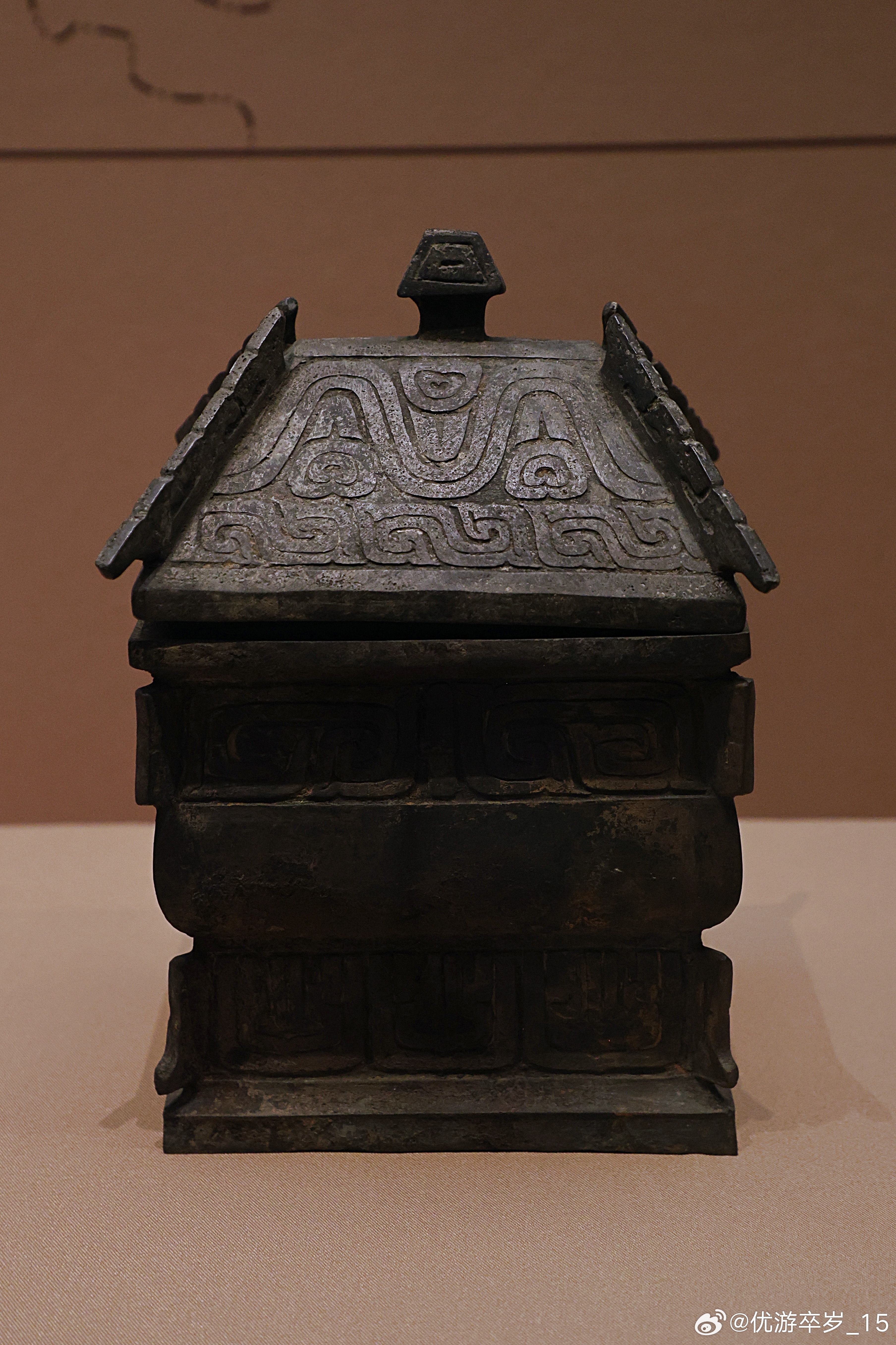 我的2026 【中国之中-中原古代文明精粹】铜方彝西周(公元前1046-前771年)河南南水北调博物馆藏南阳夏晌铺墓地出土。其造型仿自宫室,庑殿顶式器盖,盖顶设一同形小钮。器身为长方体,侈口,方折沿,颈部微束,鼓腹饱满,下接方形高圈足,足下再有折沿。器身与器盖的四角及中线处设置勾形扉棱。盖面饰山纹与窃曲纹,口沿下环饰窃曲纹带,圈足则满饰垂鳞纹。彝是周代重要的盛酒礼器,专用于祭祀宴飨,《周礼·春官》载有"六彝"之制。清华大学艺术博物馆展出2026.2.8