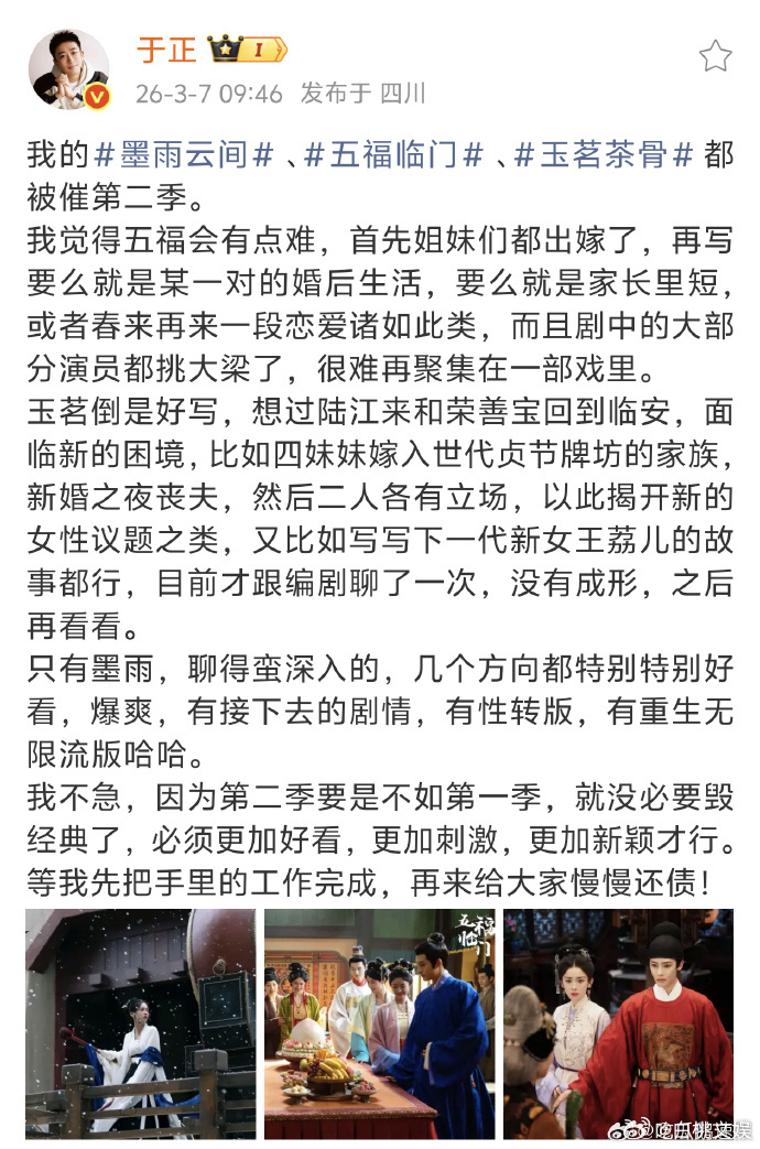 于正回应墨雨云间五福临门玉茗茶骨第二季于正五福临门第二季有点难 于正回应第二季争议,直言《五福临门》第二季不好搞。这种对续集的谨慎态度反而赢得尊重——与其毁经典赚快钱,不如让观众记住第一季的好。