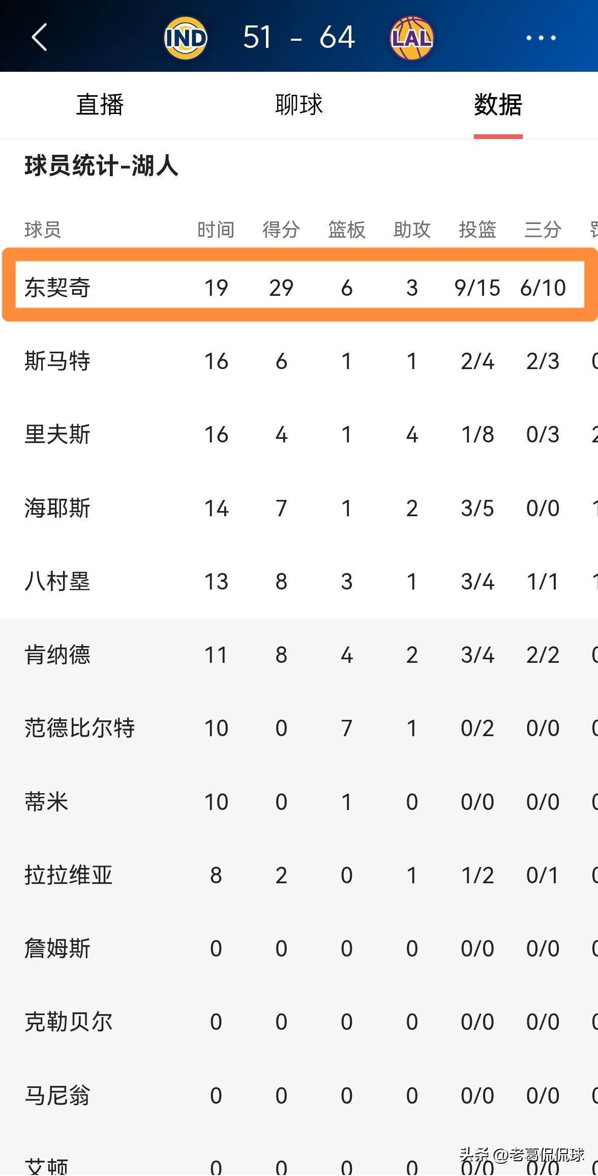 湖人超级巨星东契奇又一次杀疯了!在今天湖人主场迎战步行者的比赛中,目前双方半场战罢,湖人凭借着东契奇的无解表现以64:51领先对手。在前两节比赛中,东契奇的进攻状态极其出色,他在首发出战的19分钟里,投篮15中9,其中三分球10中6、罚球6中5狂砍29分,外加6篮板3助攻2抢断1盖帽,他的场上正负值为+14。 毫不夸张的说,以东契奇目前的火热状态来看,我预感本场比赛东契奇的得分会突破50分。
